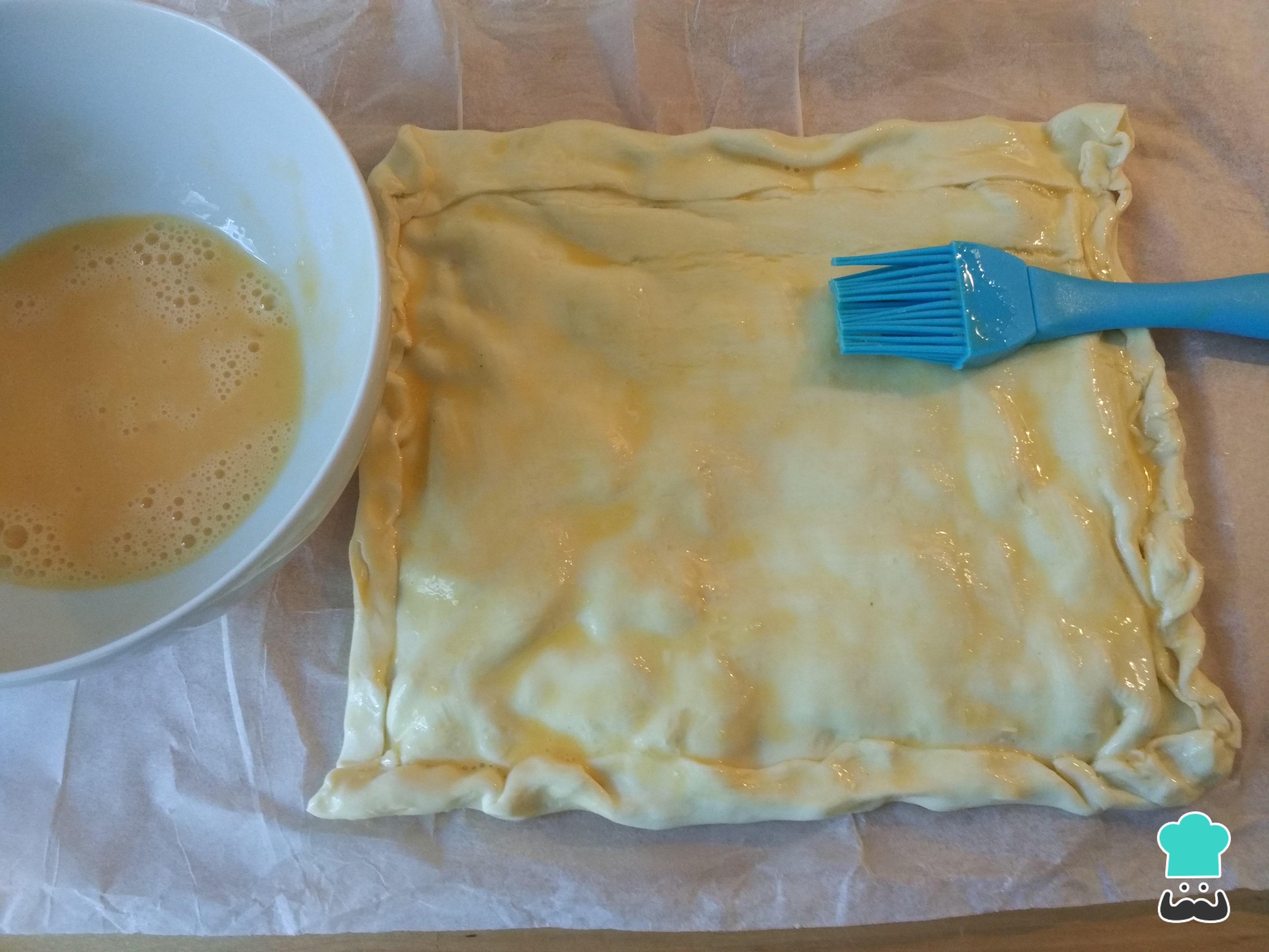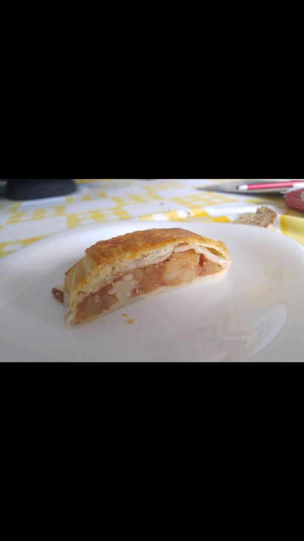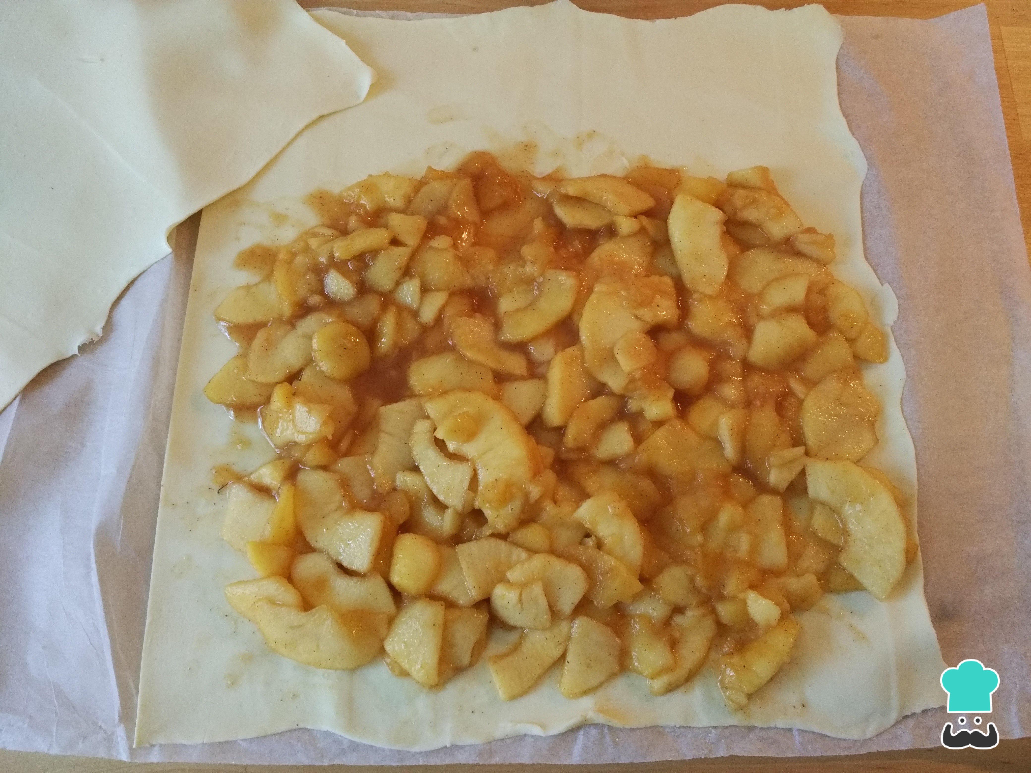 Abra a massa folhada, corte ao meio e espalhe a maçã cozida em uma das metades. Arrume o recheio de maçã ao centro, e cubra com a outra metade de massa.