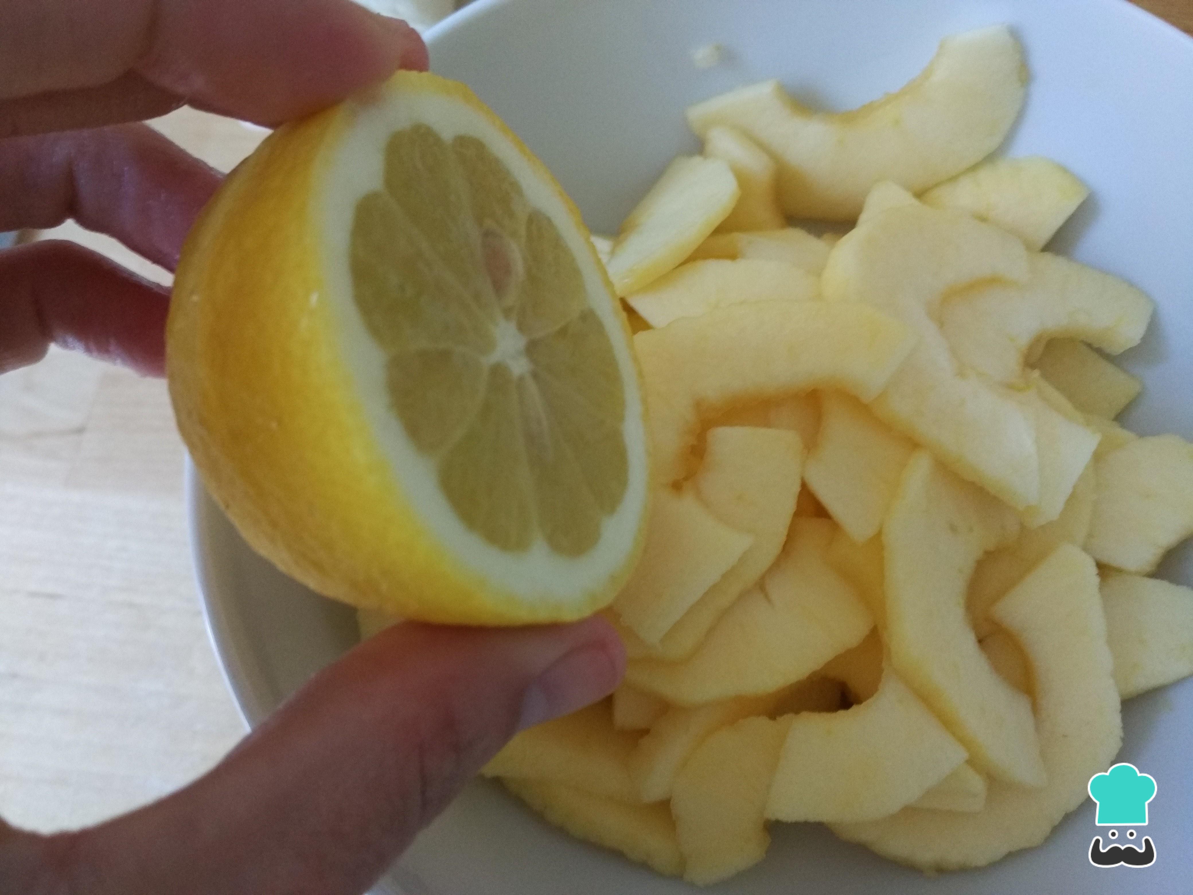 Em seguida descasque as maçãs e a parte do caroço. Corte em fatias finas e regue com o suco de limão, para evitar que escureçam.