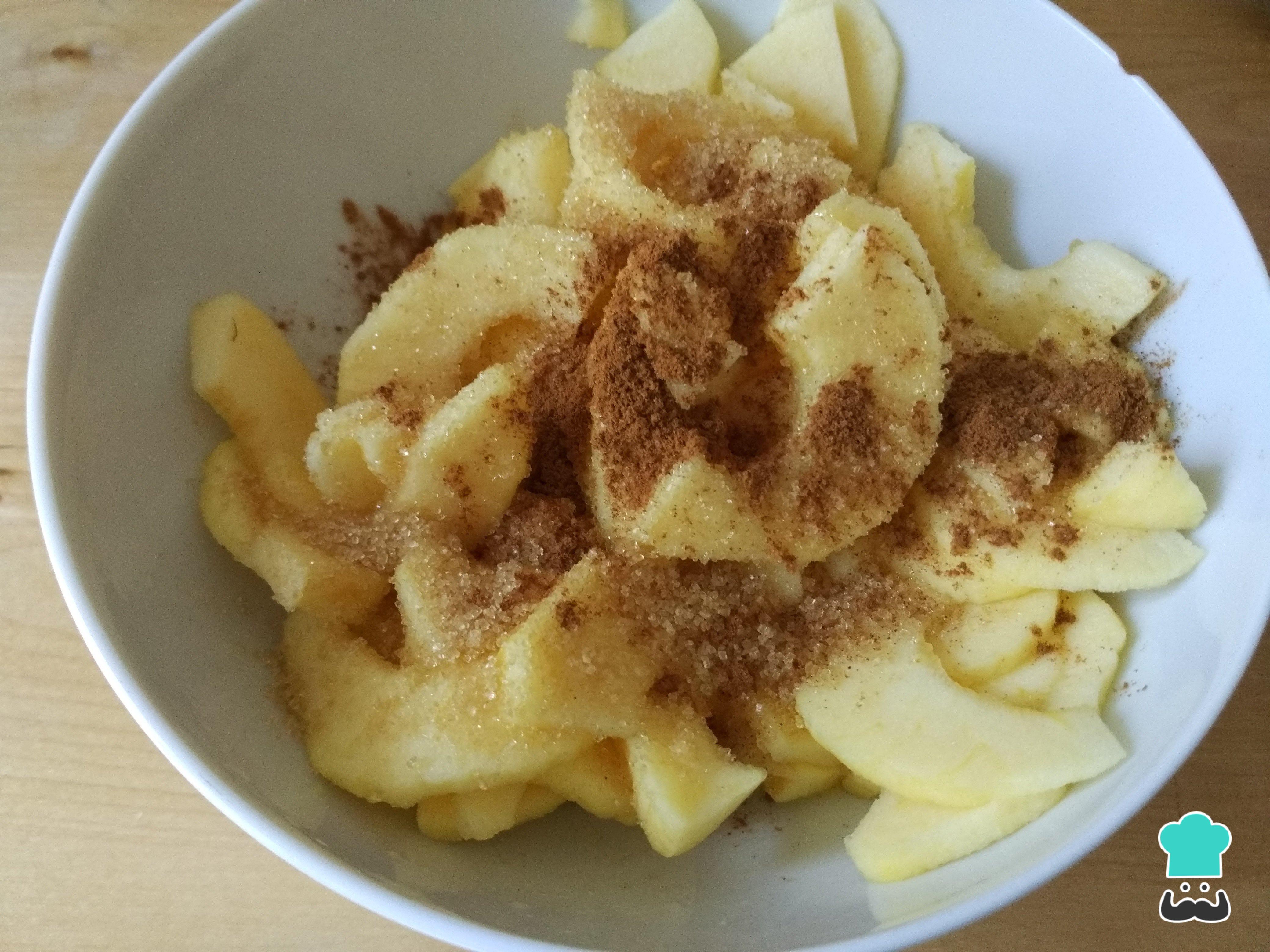 Acrescente a canela, o açúcar e a essência, e misture. Deixe a maçã repousar por 5-10 minutos, para que comece libertando seus sucos.