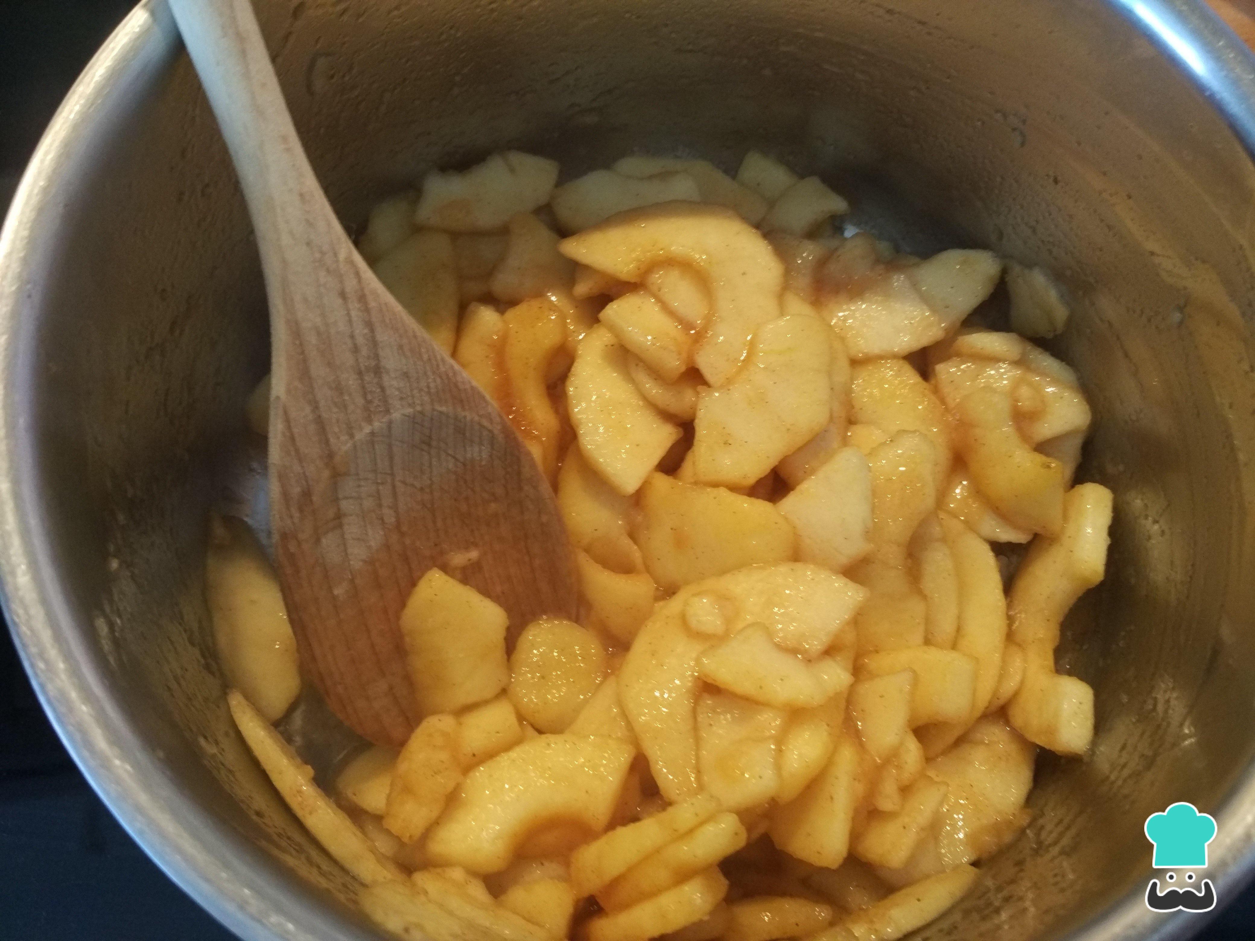 O passo seguinte deste strudel de maçã com massa folhada é levar ao fogo uma panela com a manteiga e, quando estiver derretida, acrescentar a maçã temperada. Mexa e cozinhe por 3-4 minutos, ou até a maçã ficar macia.