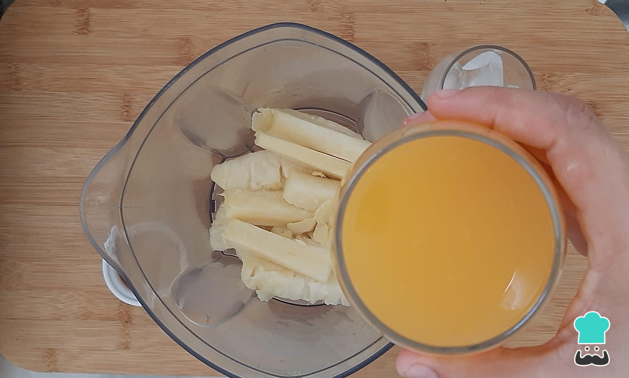 No liquidificador, coloque o abacaxi cortado sem a casca e adicione o suco de laranja.
