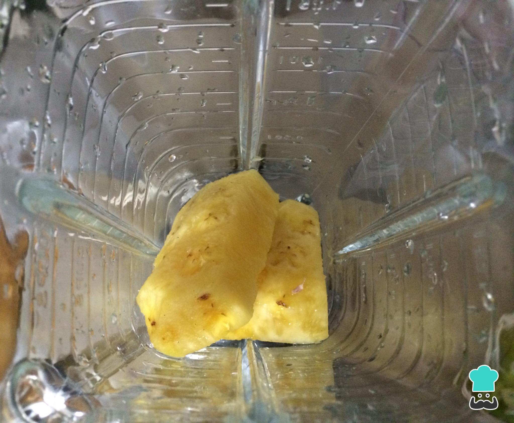 Descasque o abacaxi e corte-o em pedaços. Coloque no liquidificador com um pouco de água e bata até obter uma consistência homogênea.