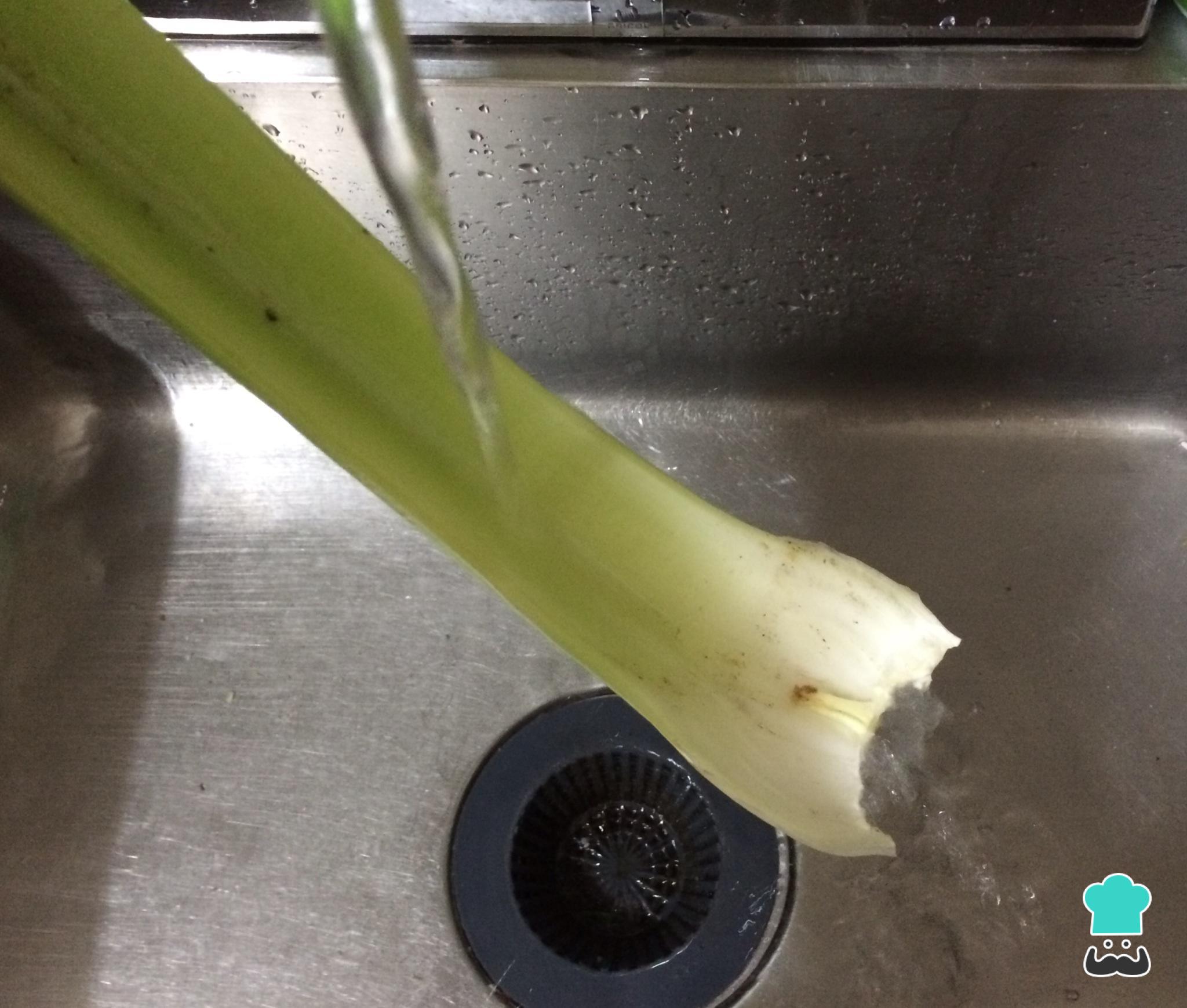 Lave muito bem o talo de aipo de forma a remover a sujeira. Corte a parte inferior.