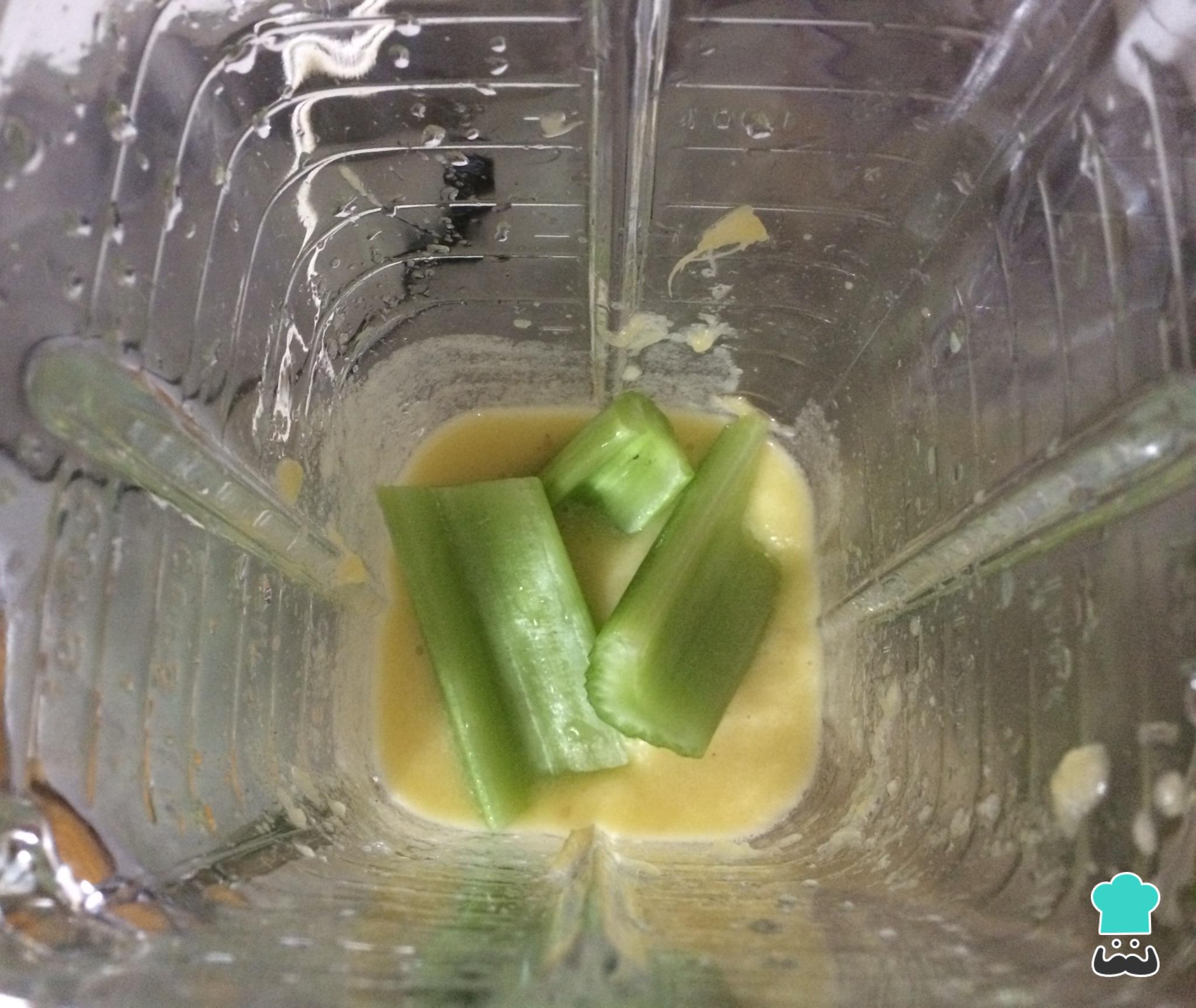 Corte o aipo em pedaços grandes e adicione-o ao liquidificador. Volte a bater até obter uma consistência de suco (se quiser pode adicionar mais água).