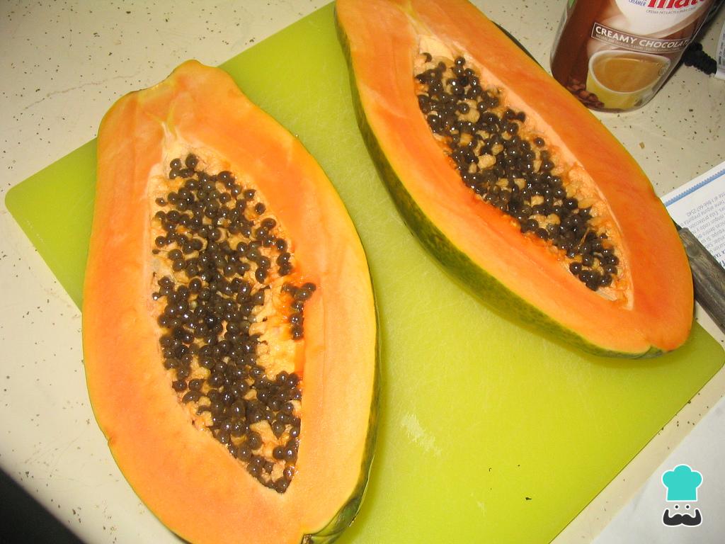 Descasque a maçã, a papaia, a cenoura e o gengibre. Retire as sementes da maçã e da papaia e pique tudo em pedacinhos. Coloque no liquidificador.