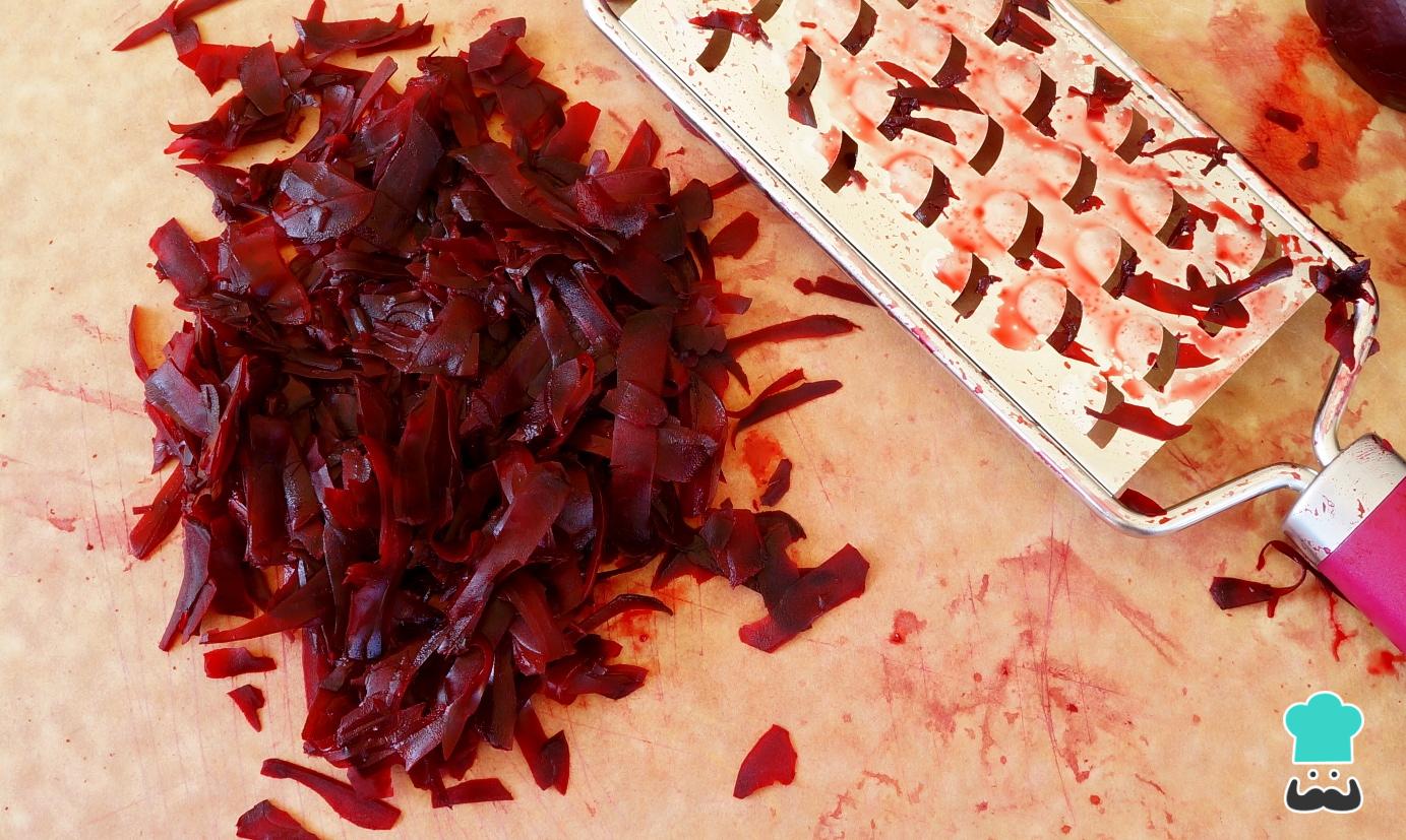 É bem simples preparar essa receita de suco rosa de beterraba! Comece por ralar a beterraba, até obter cerca e 2 colheres de sopa de raladura.