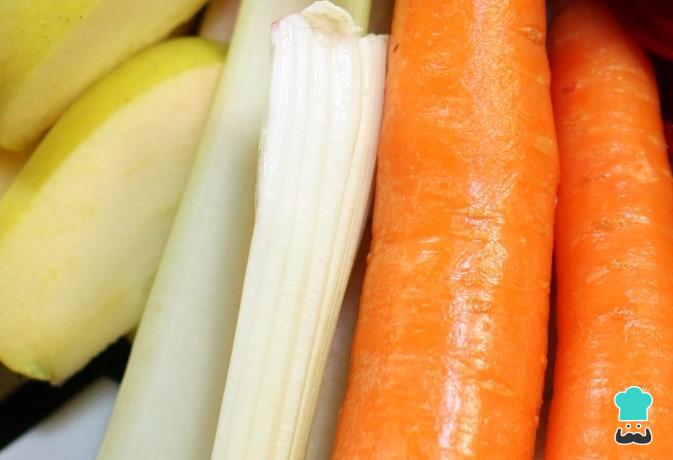 Se não, não se preocupe, e comece por lavar muito bem todos os ingredientes, mantendo a pele da maçã e da cenoura e as folhas do aipo.