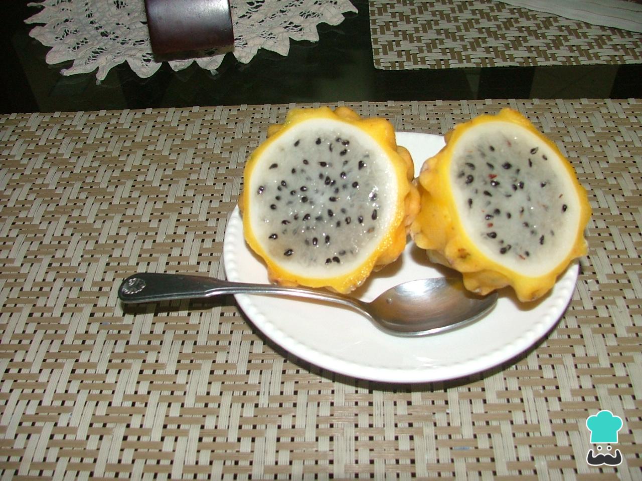 Corte a fruta de dragão ao meio e, com uma colher, retire a polpa.