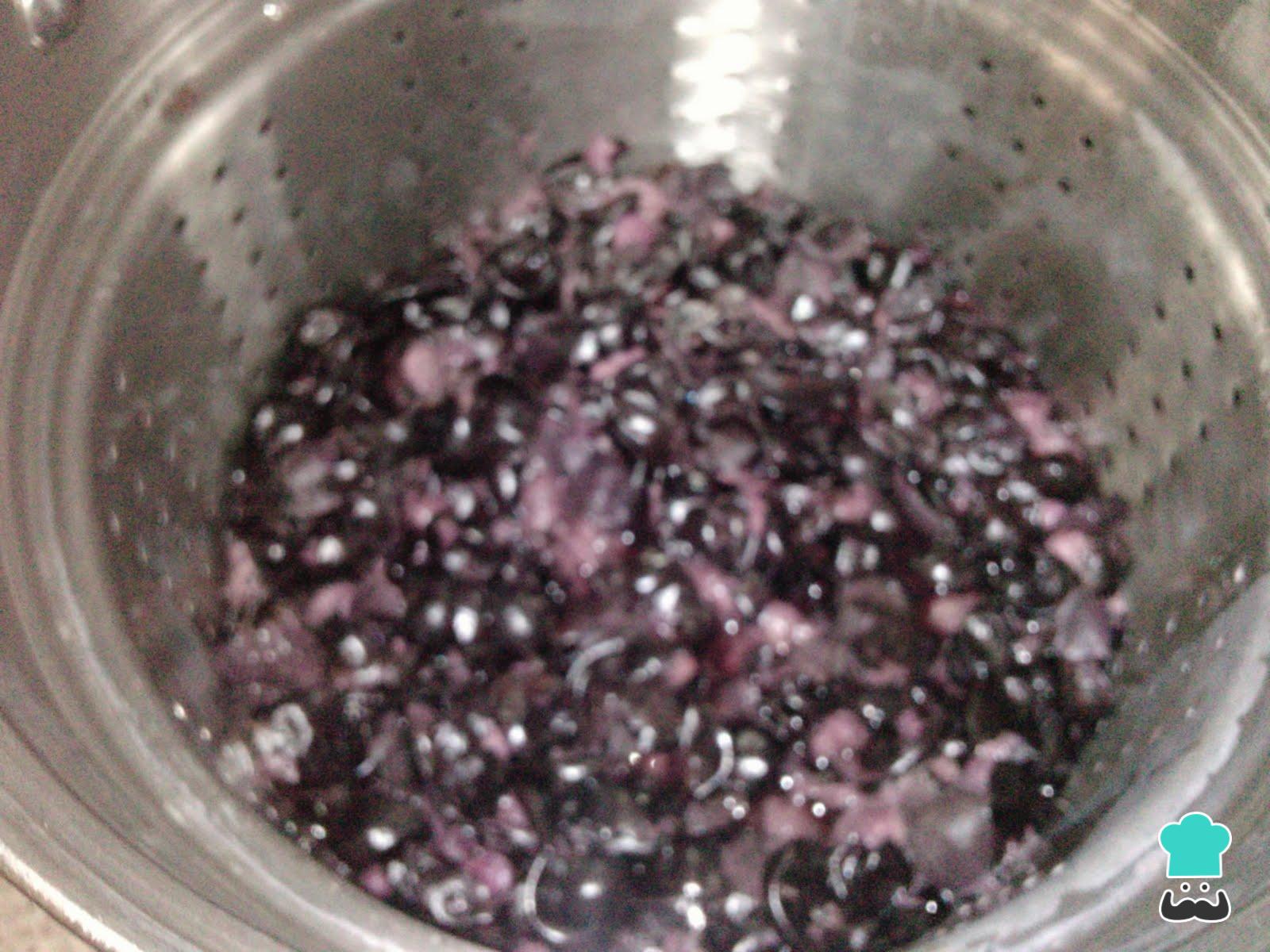 Quando a água ferver, junte as jabuticabas e amasse as frutas. Continue cozinhando até a água ganhar uma coloração violeta. De seguida, coe o suco e coloque-o em um recipiente alto, como uma jarra.
