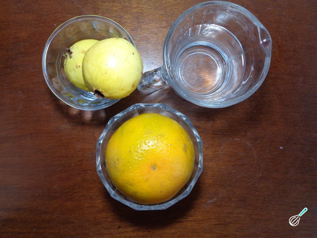 Na foto abaixo, você pode ver os ingredientes necessários para a preparação deste delicioso suco de laranja e goiaba.