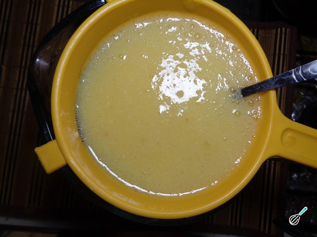 Coloque os pedaços de laranja e goiaba no liquidificador junto com um litro de água e bata até obter uma mistura homogênea.