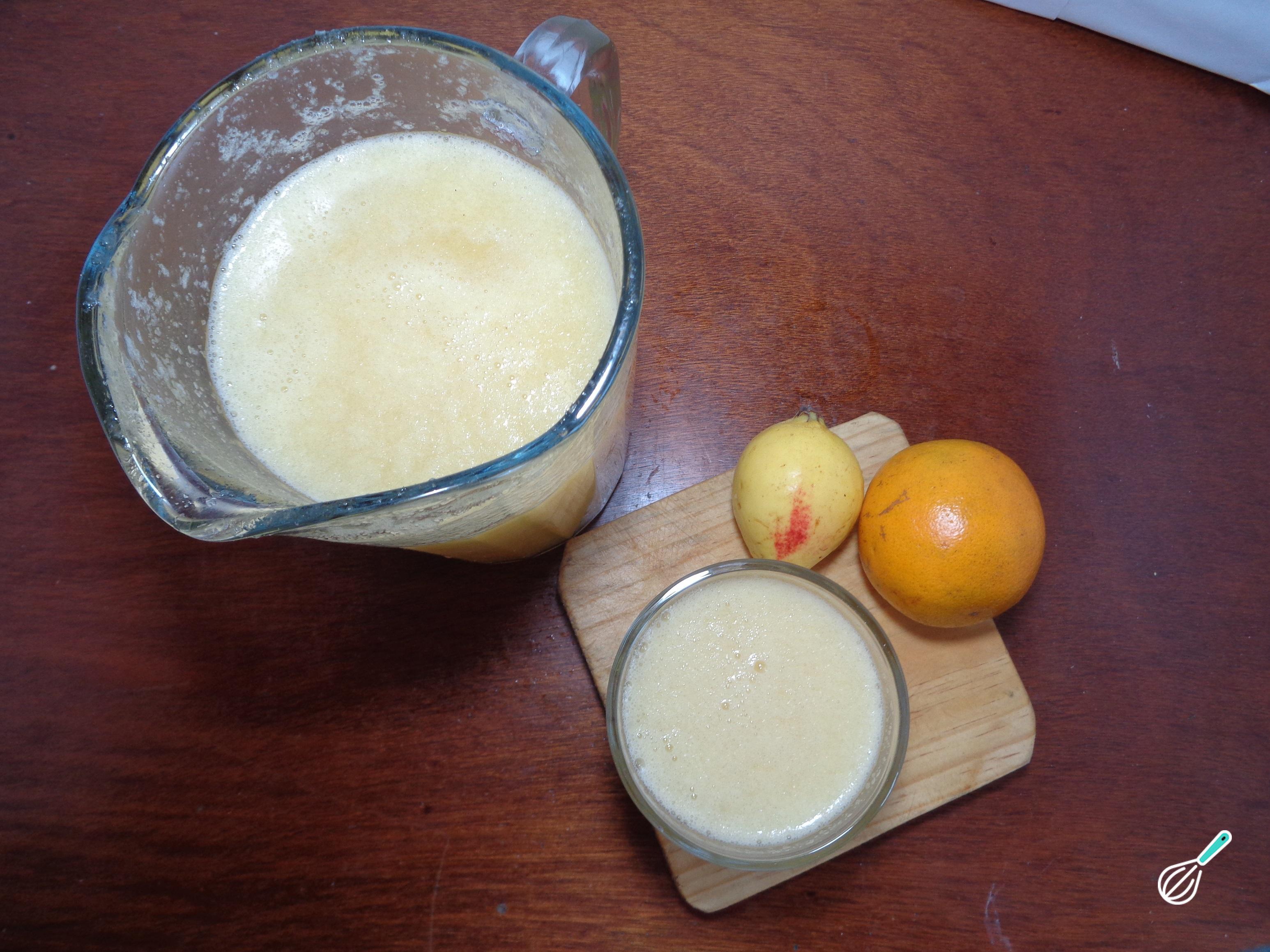 Uma vez esvaziada a mistura toda, mexa bem e o suco de laranja e goiaba está pronto!