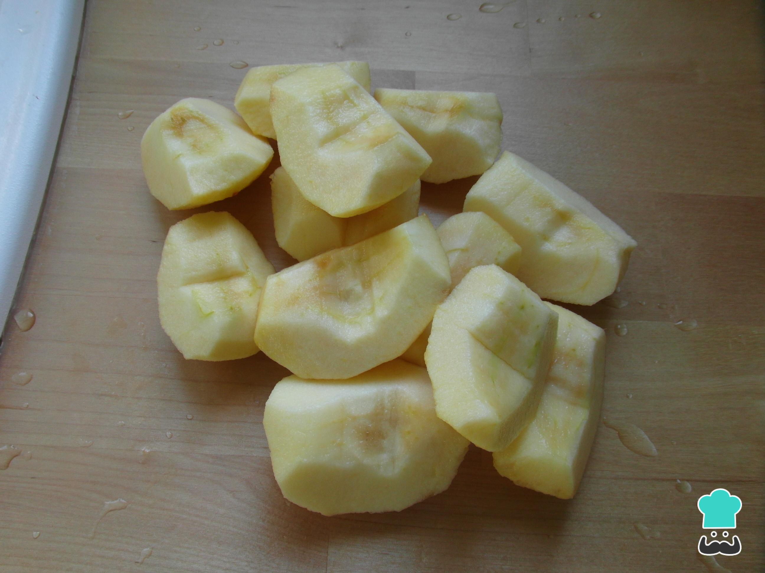 Descasque as maçãs e corte-as em quartos, retire a parte do meio.