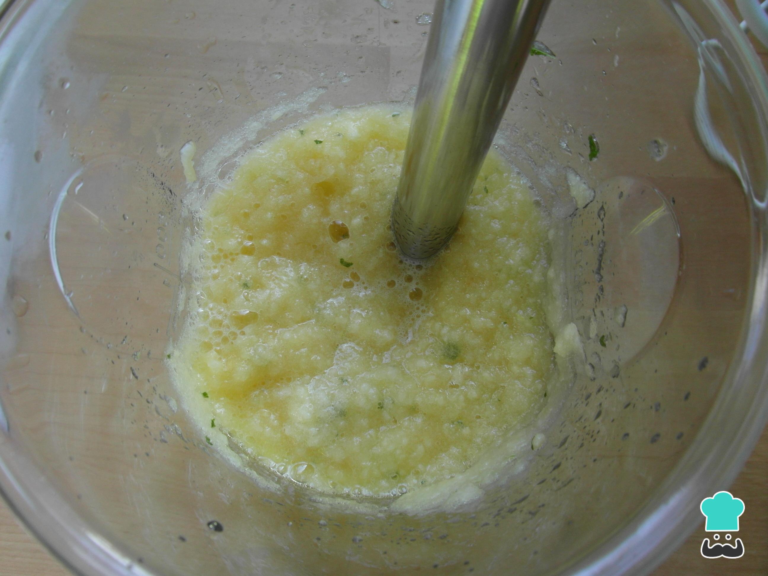 Coloque no liquidificador ou em um copo alto (caso use o mixer) as maçãs cortadas em pedaços menores, as folhas de hortelã e um pouco de água. Bata de forma a obter um purê.