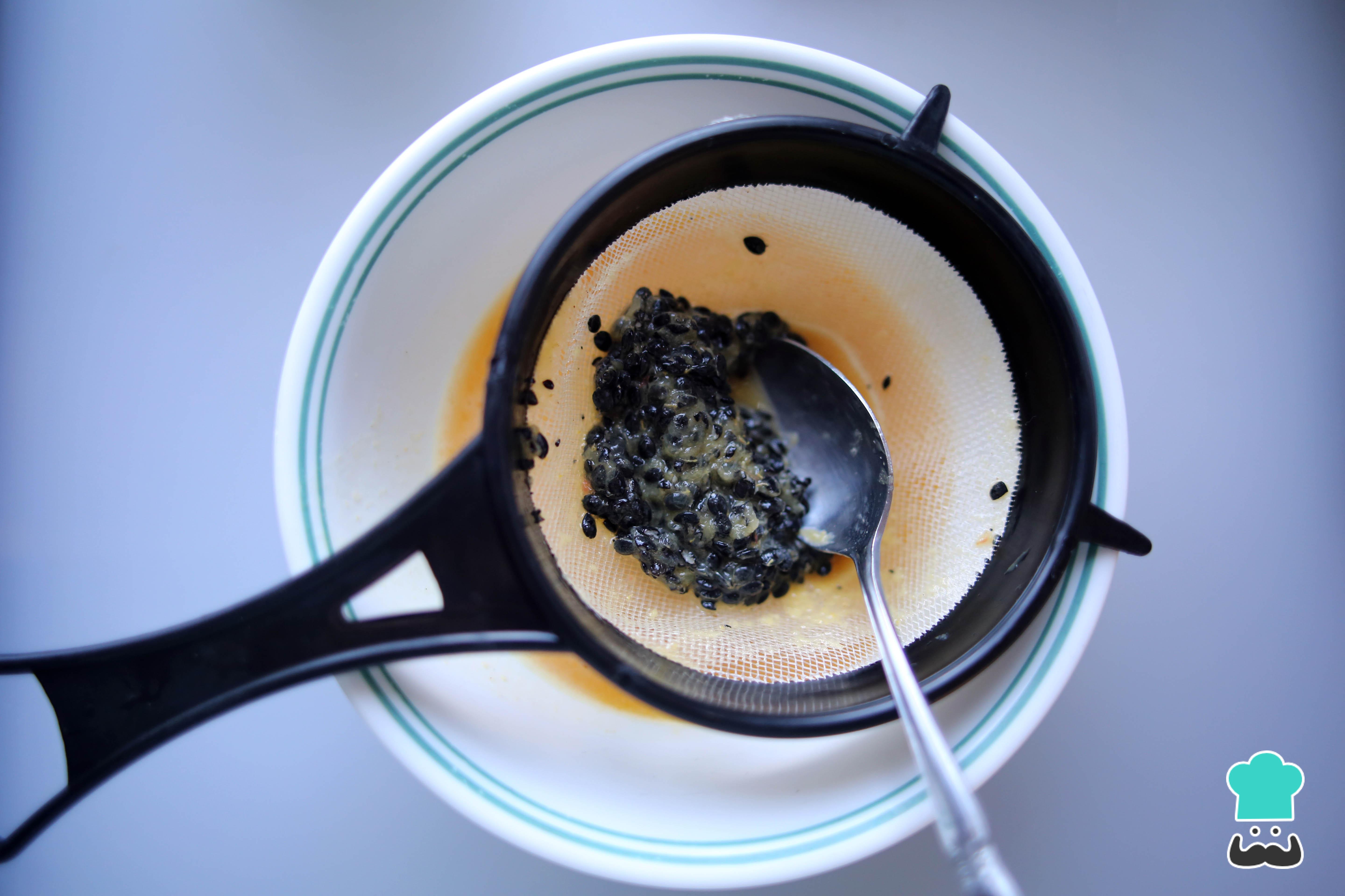 Em seguida coloque no liquidificar a polpa dos maracujás e a cenoura cortada em pedaços junto com a água. Bata muito bem, por 5 minutos, de forma a obter um suco o mais fino possível, e passe por uma peneira.