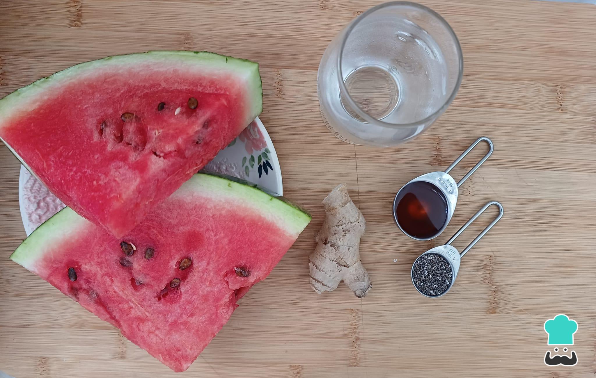 Separe os ingredientes necessários para o preparo da receita de suco de melancia com gengibre.