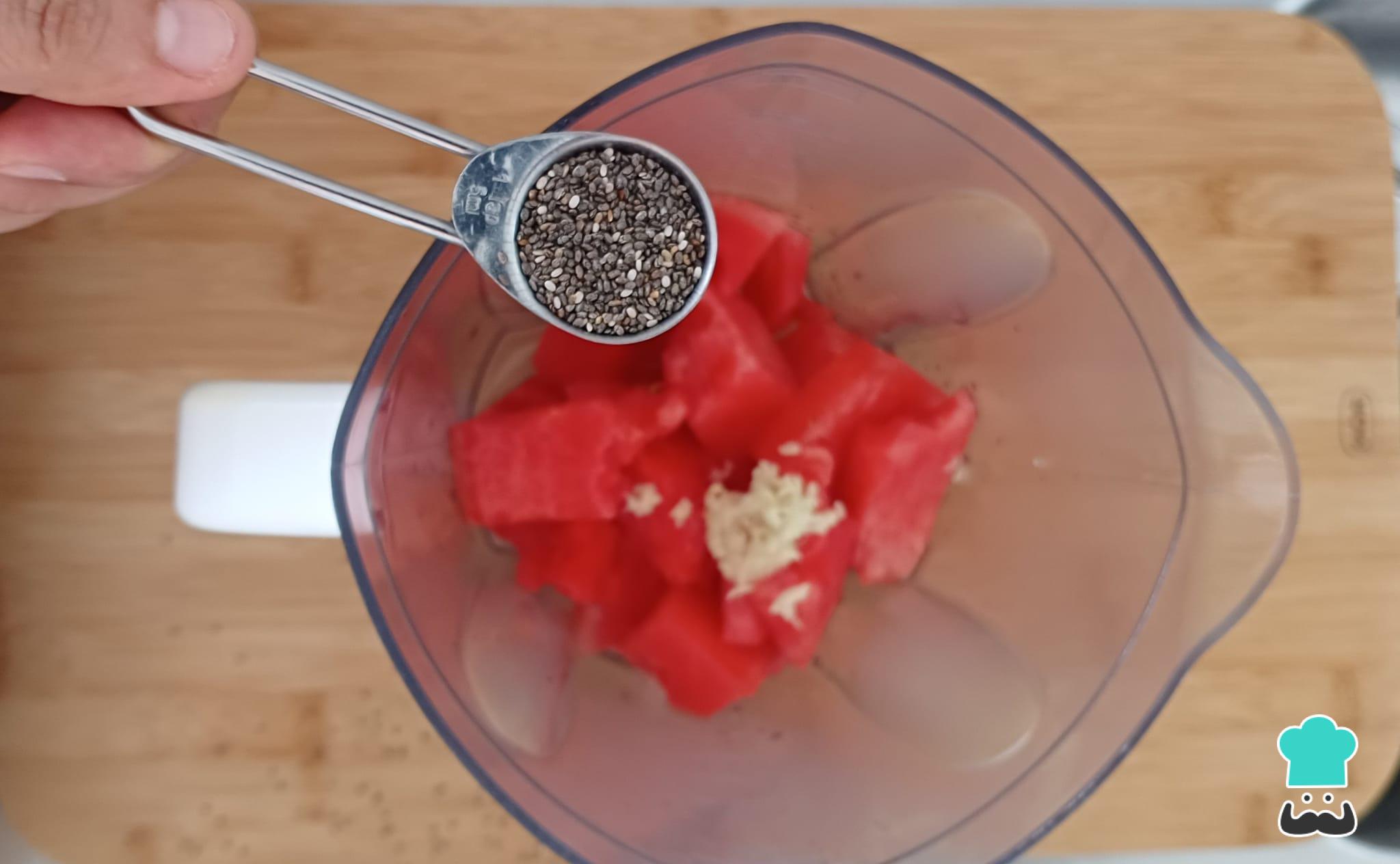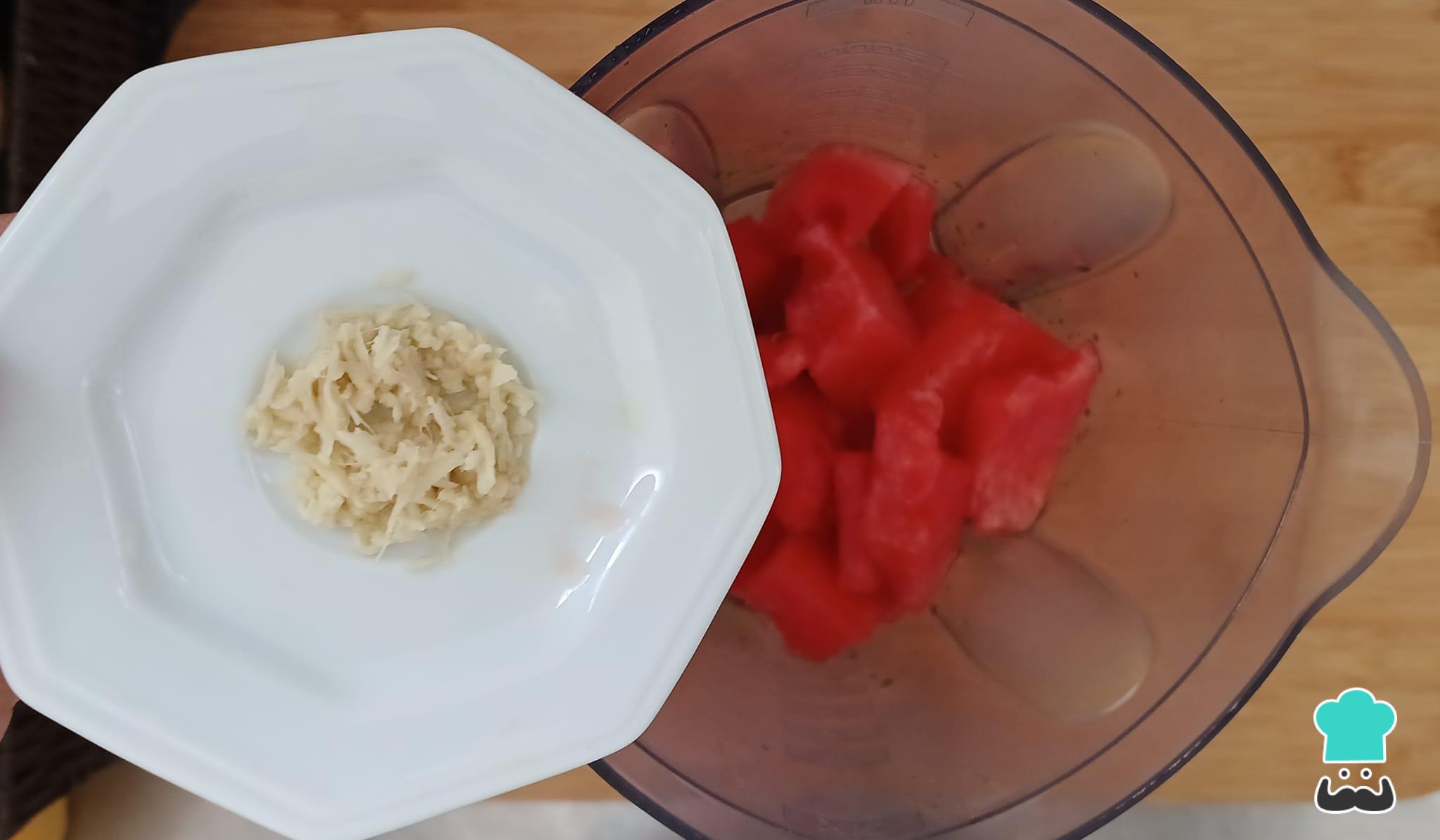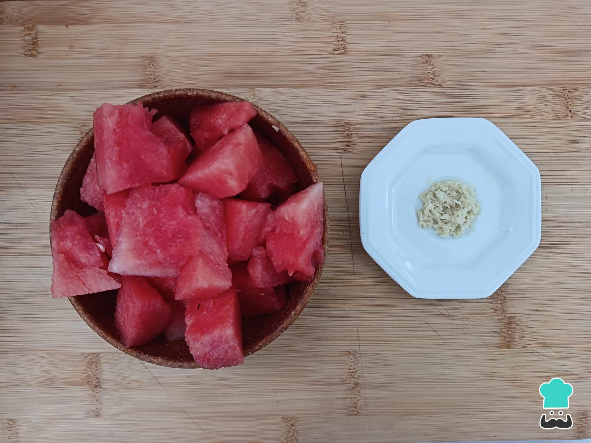 Coloque a melancia e a água de coco gelada no liquidificador. Em seguida, adicione o gengibre ralado.
