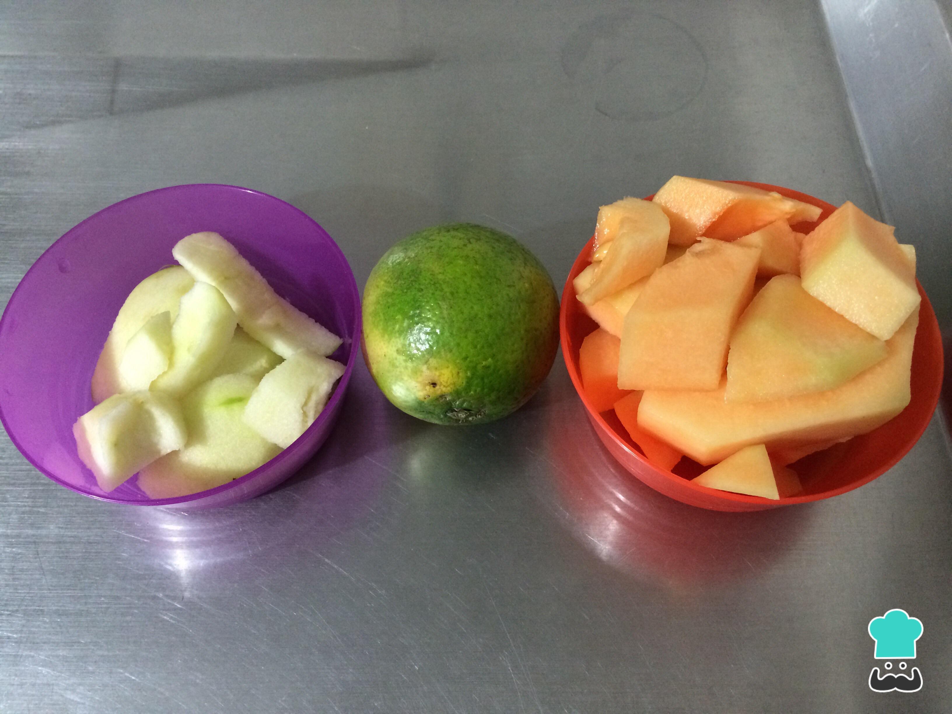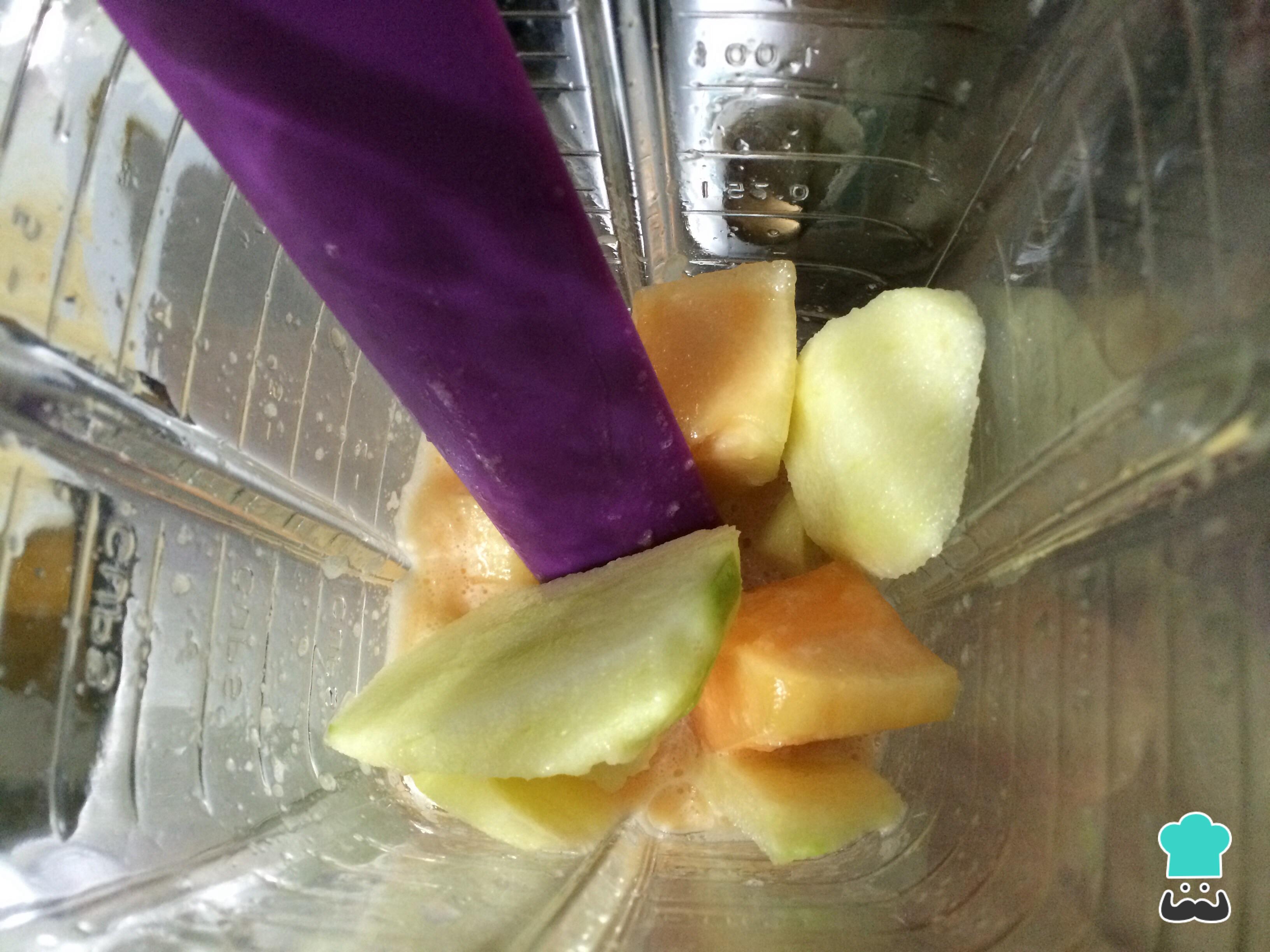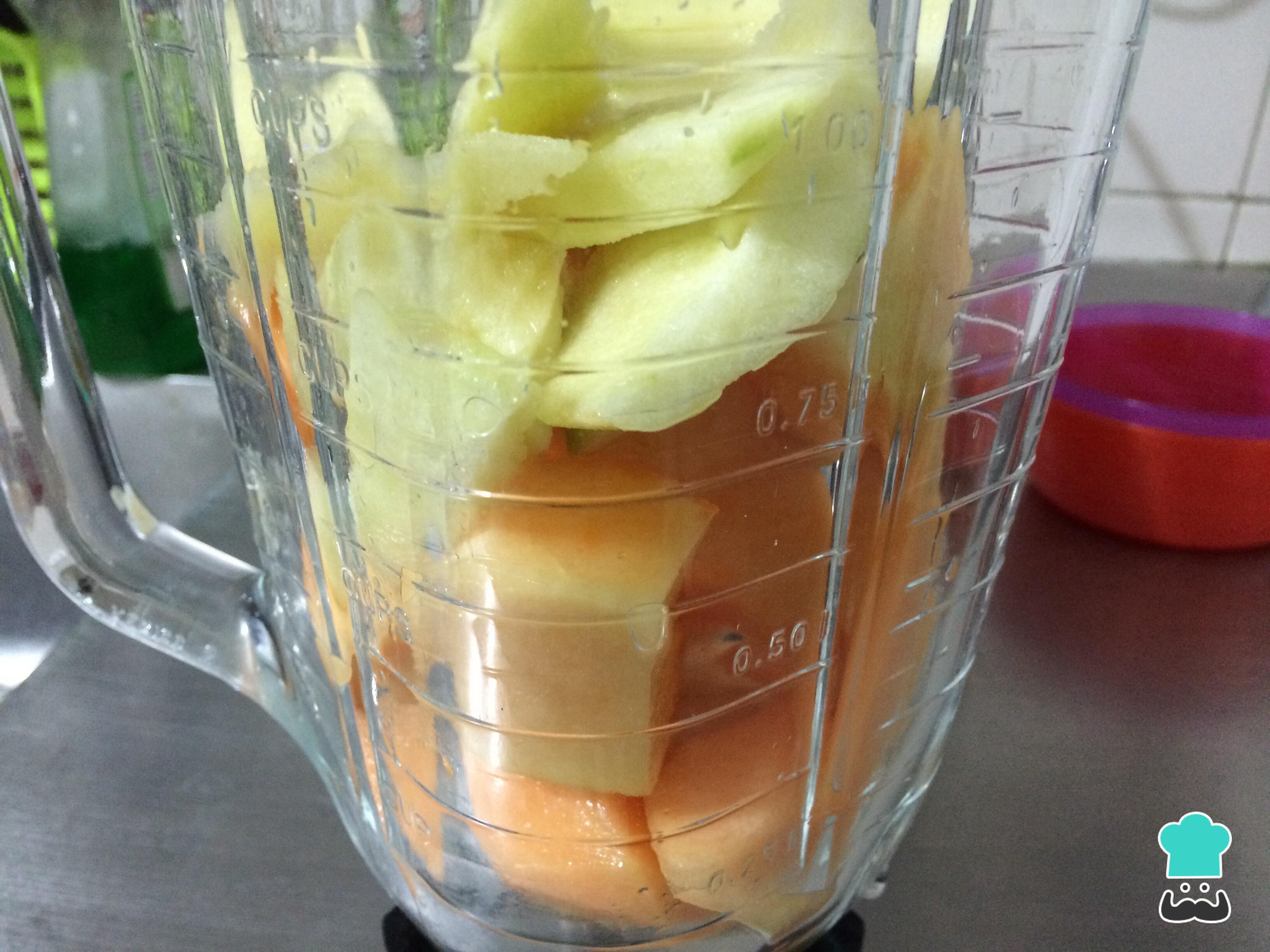 Bata no liquidificador o melão e a maçã descascados e cortados em cubos médios, junto com o suco de laranja.