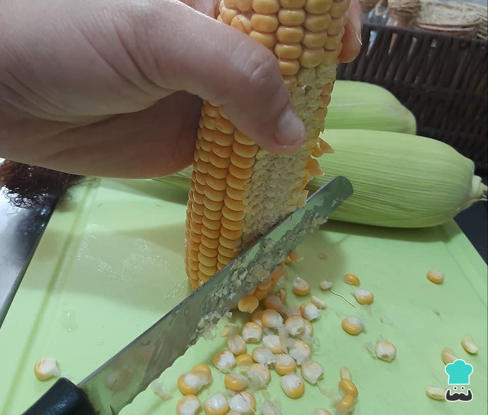 Começamos preparando o curau de milho simples: primeiro debulhe os grãos do milho com a ajuda de uma faca ou se preferir, rale no ralador.