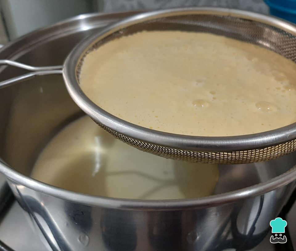 Bata no liquidificador os grãos do milho junto com o leite de coco e o leite de vaca, até obter uma mistura lisinha. Depois coe diretamente numa panela com a ajuda de uma peneira, para descartar o bagaço.