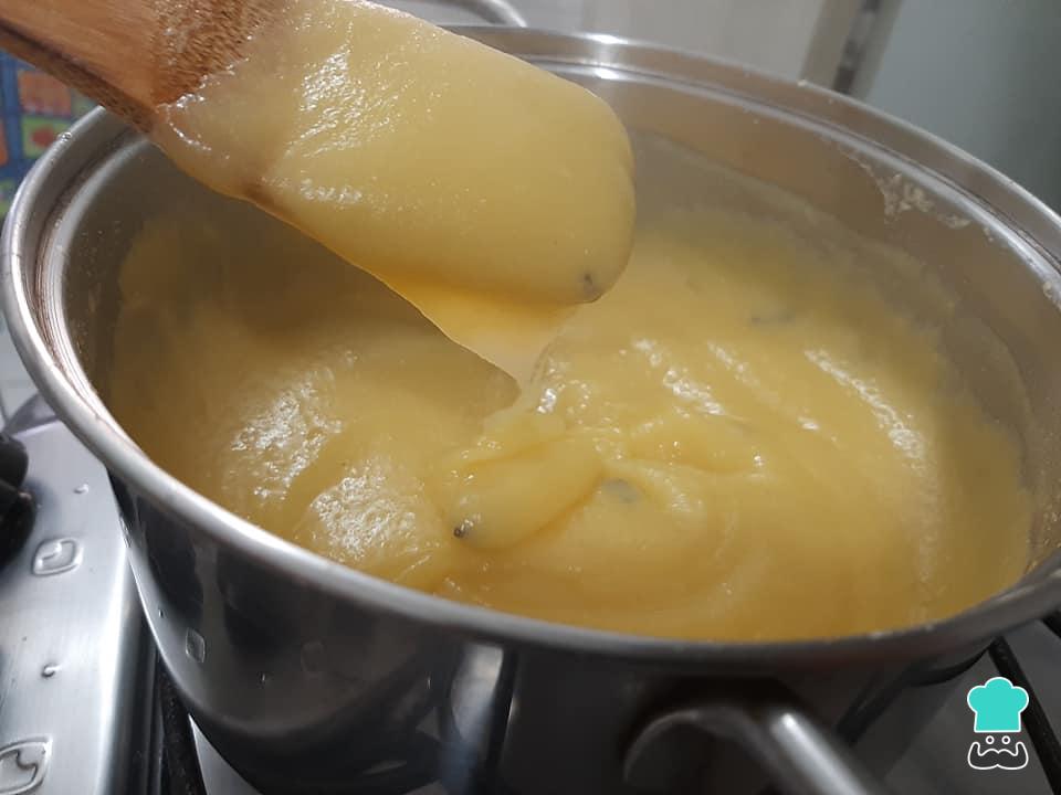 Na panela adicione o açúcar, os cravos, a canela e a pitada de sal ao creme de milho. Misture tudo e cozinhe em fogo médio, mexendo sem parar até chegar na consistência de mingau e começar a soltar do fundo da panela. Nesse momento desligue o fogo e deixe esfriar.
