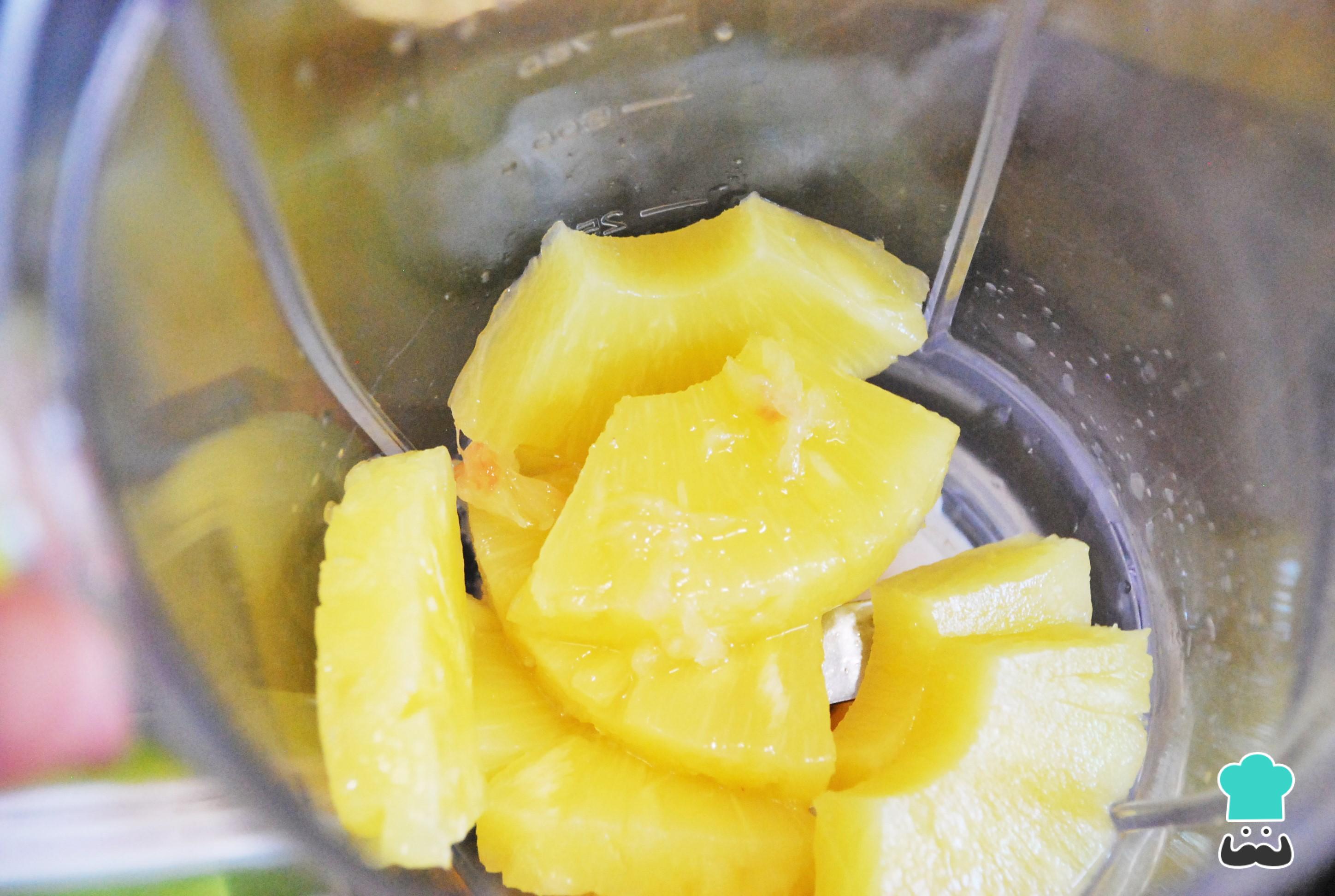 Coloque as frutas no liquidificador ou em uma máquina de suco e processe até virar um suco lisinho. Se estiver muito espesso adicione água de coco, de preferência gelada.