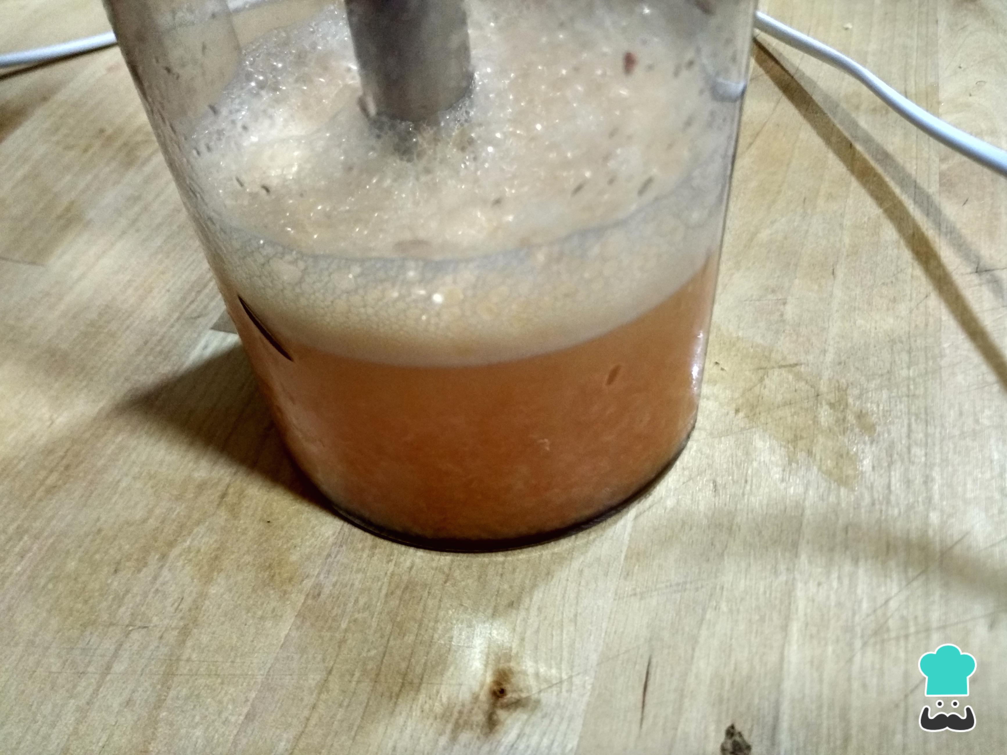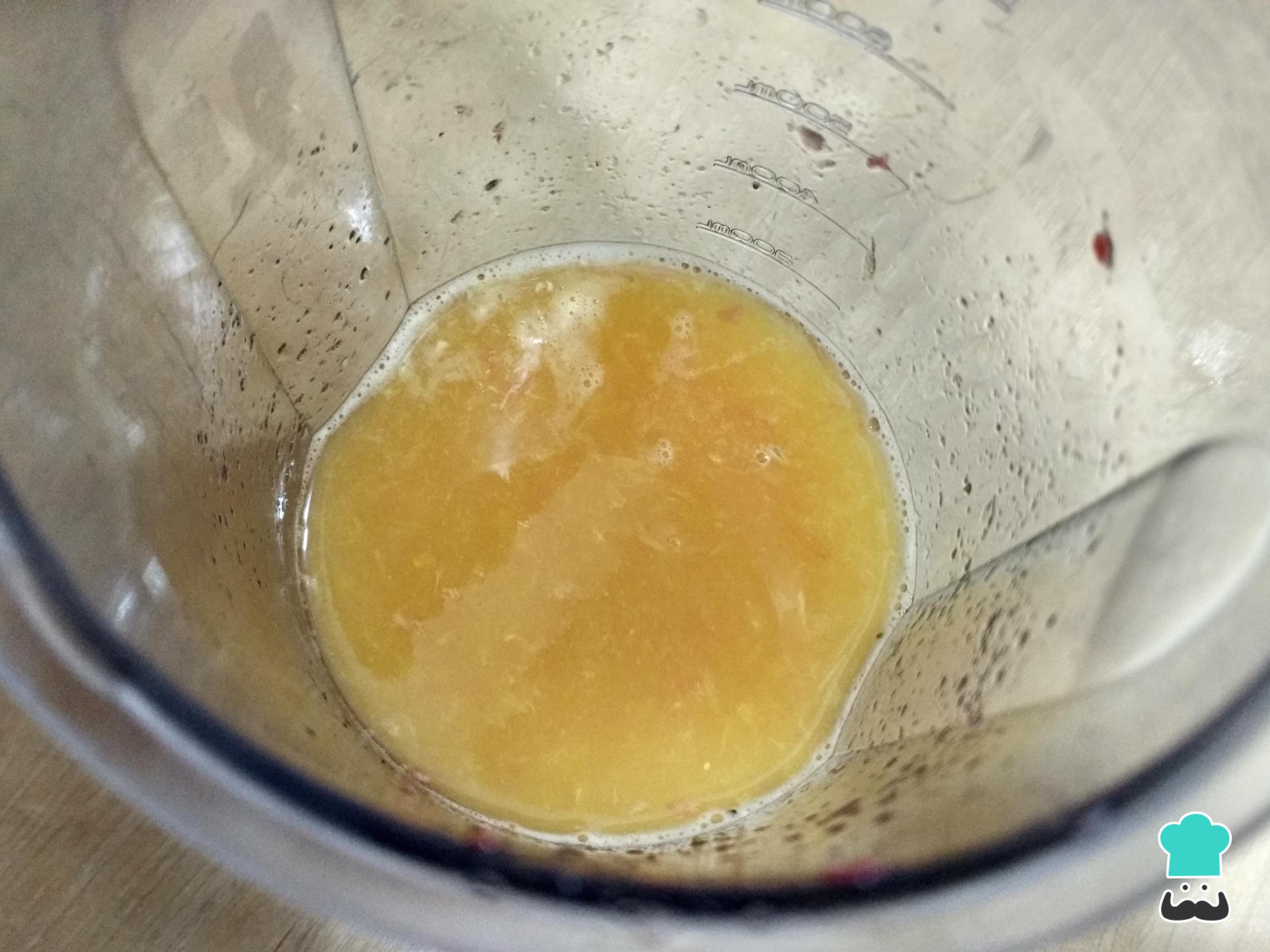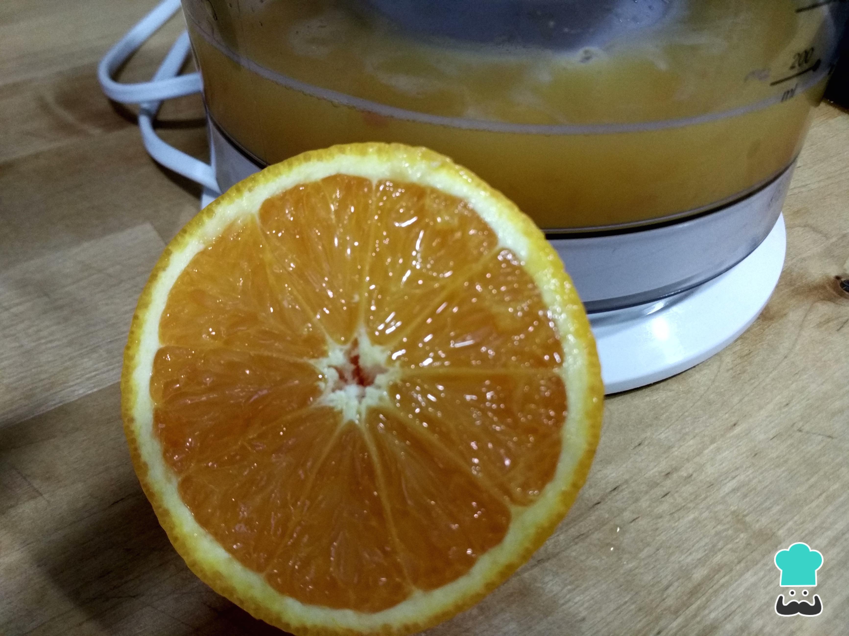 Em primeiro lugar faça o suco de laranja, espremendo as laranjas com a ajuda de um espremedor de frutas. Se você não tem um, simplesmente retire as sementes e esprema as laranjas com as mãos.