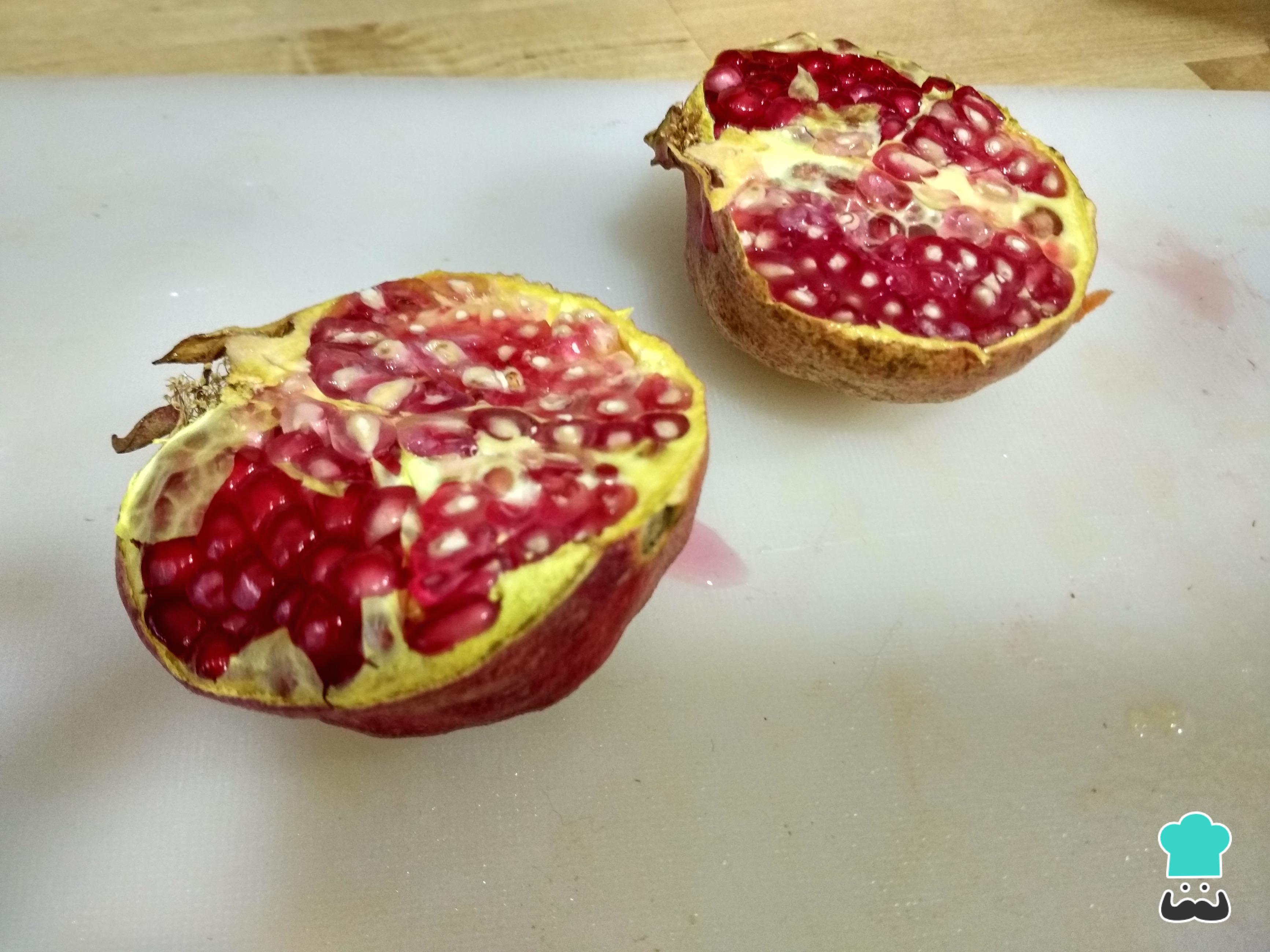 Corte as romãs ao meio e esprema-as com a ajuda do espremedor. Para evitar perder muitos grãos, aperte bem a romã contra o espremedor.
