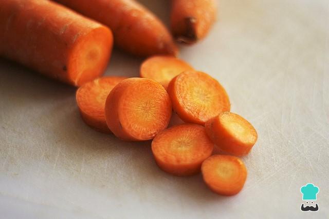 Separadamente, descasque, lave e corte as cenouras em pedaços, assim ficará mais fácil triturar. Se você tem um extrator de suco, não será necessário cortar em pedaços.