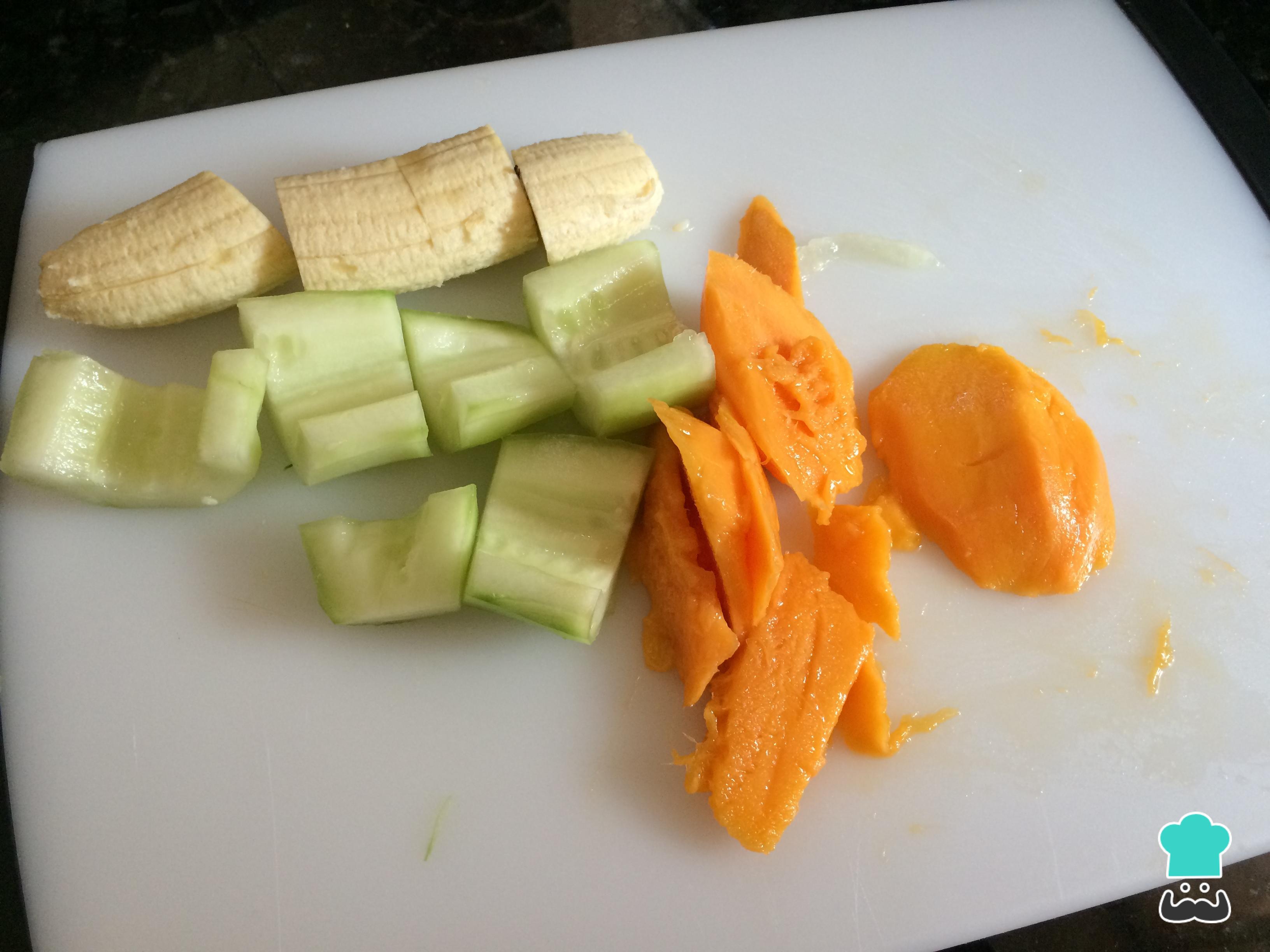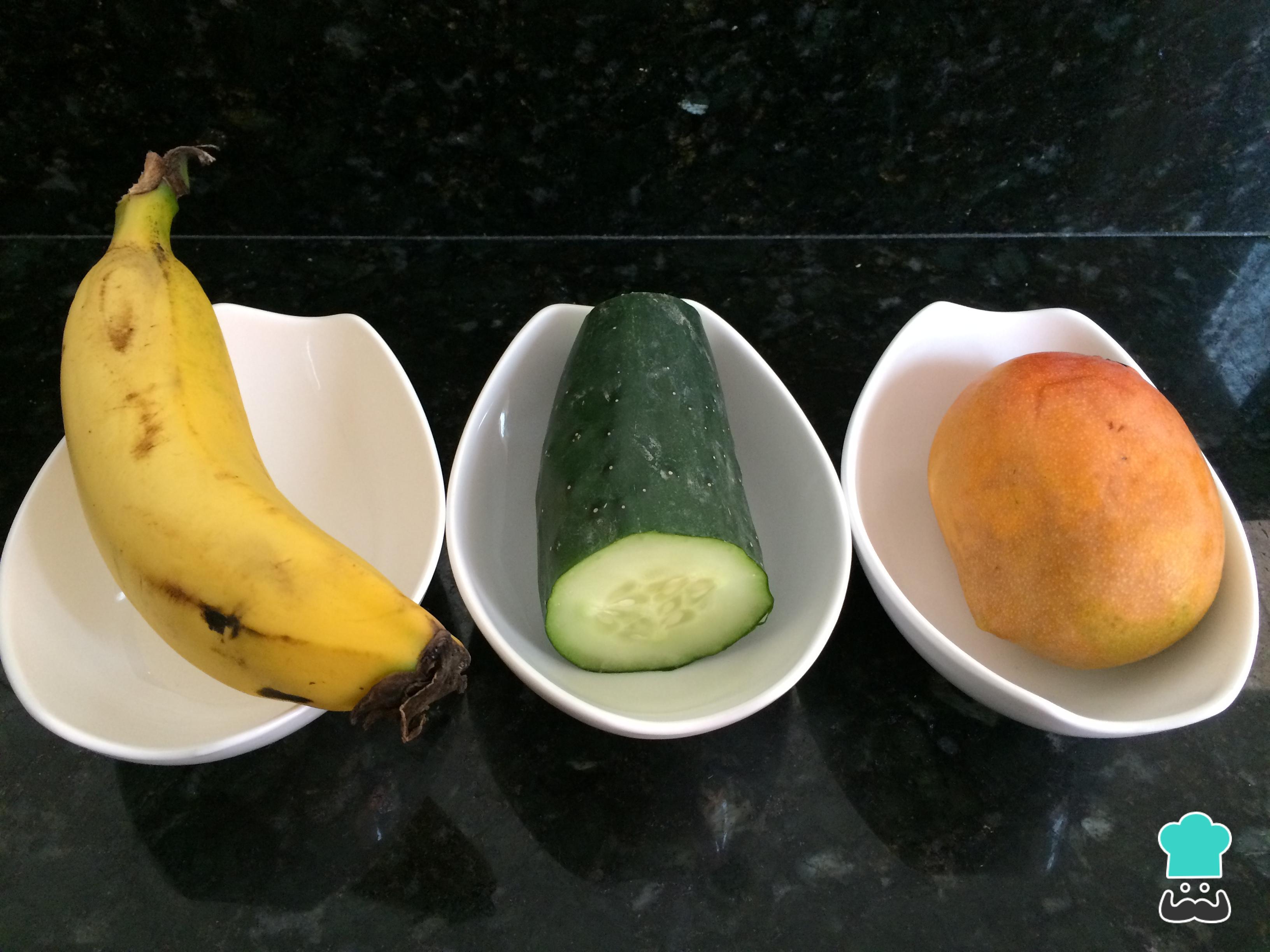 Coloque a banana, o pepino e a manga no liquidificador e bata muito bem, até obter uma consistência homogênea.