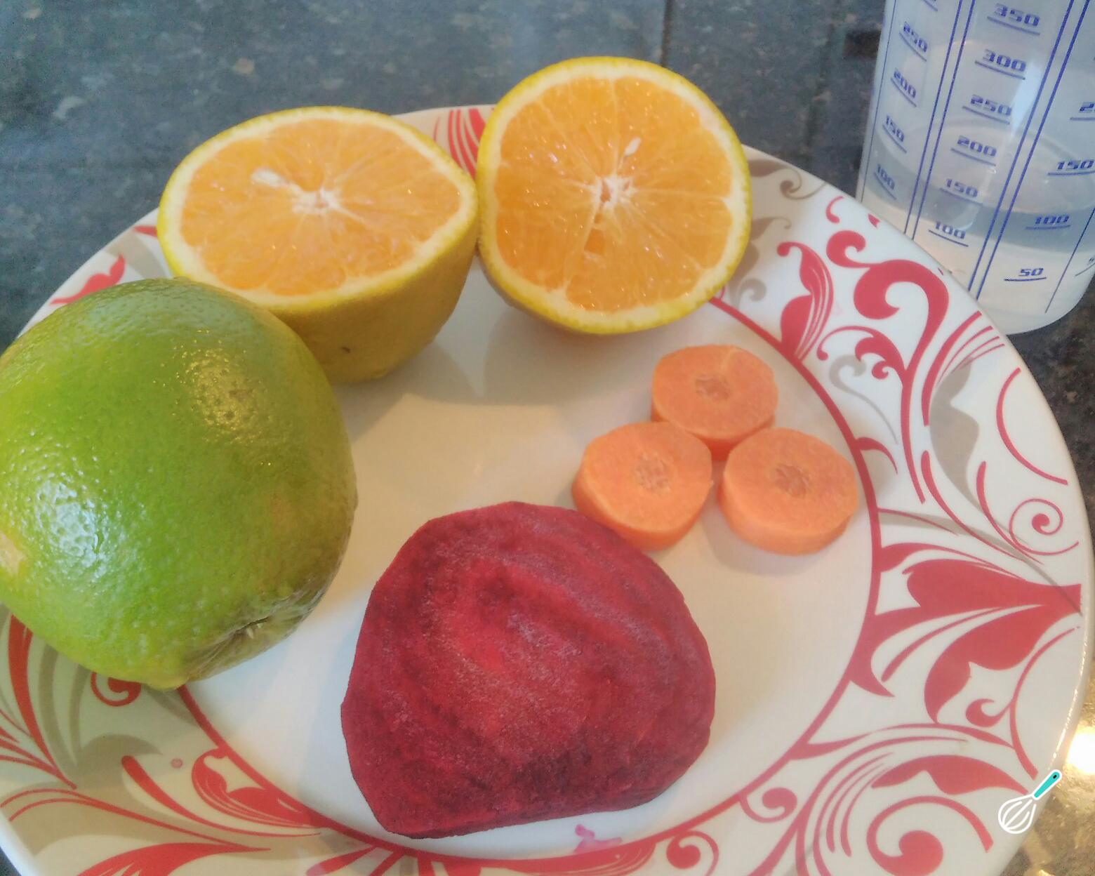 Corte 3 rodelas de cenoura (1 cm cada), 1 fatia de beterraba (1 cm) e esprema o suco de 2 laranjas (pode ser laranja-pera).