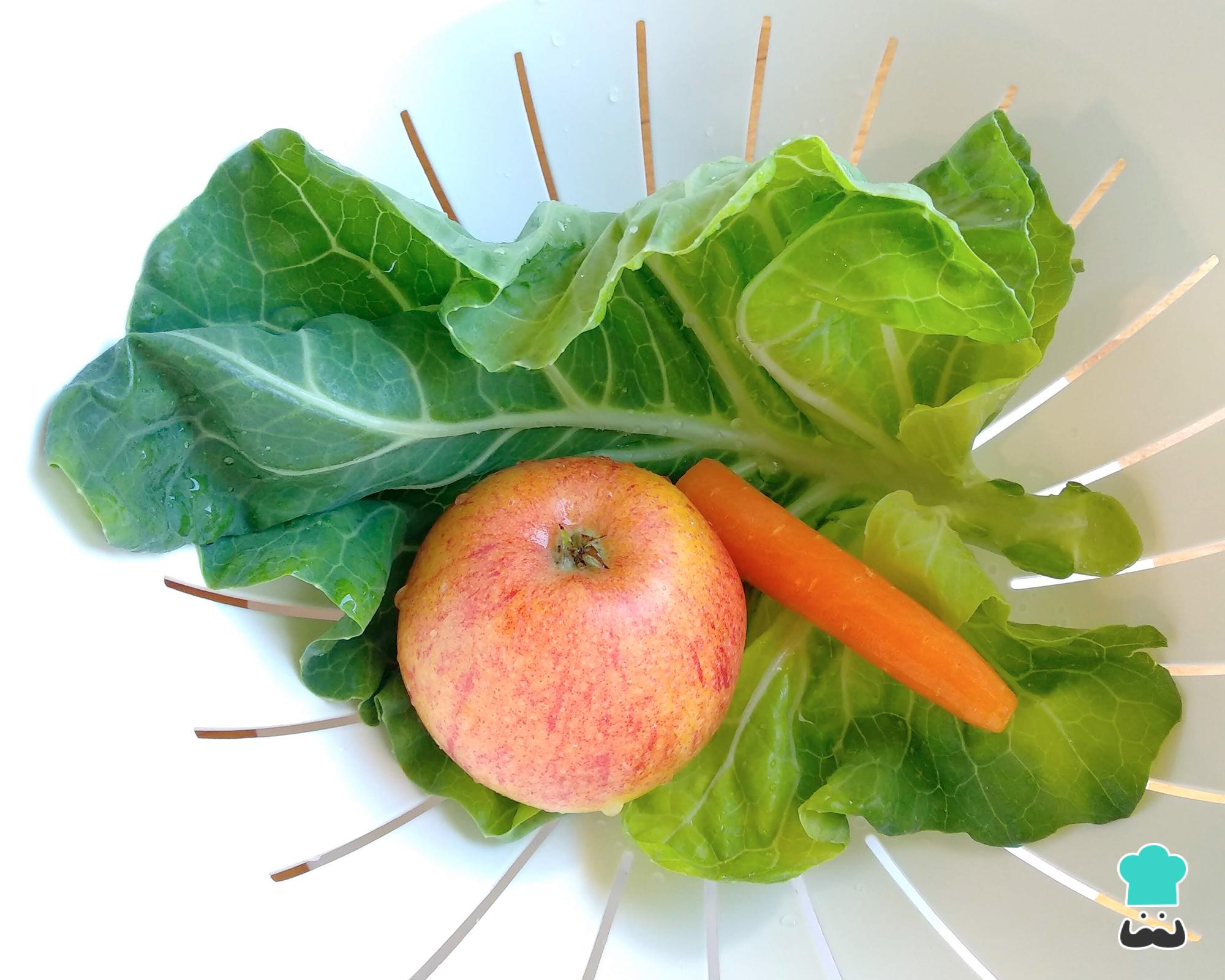 Prepare os ingredientes deste suco verde emagrecedor: lave bem a folha da couve e a maçã e descasque a cenoura.