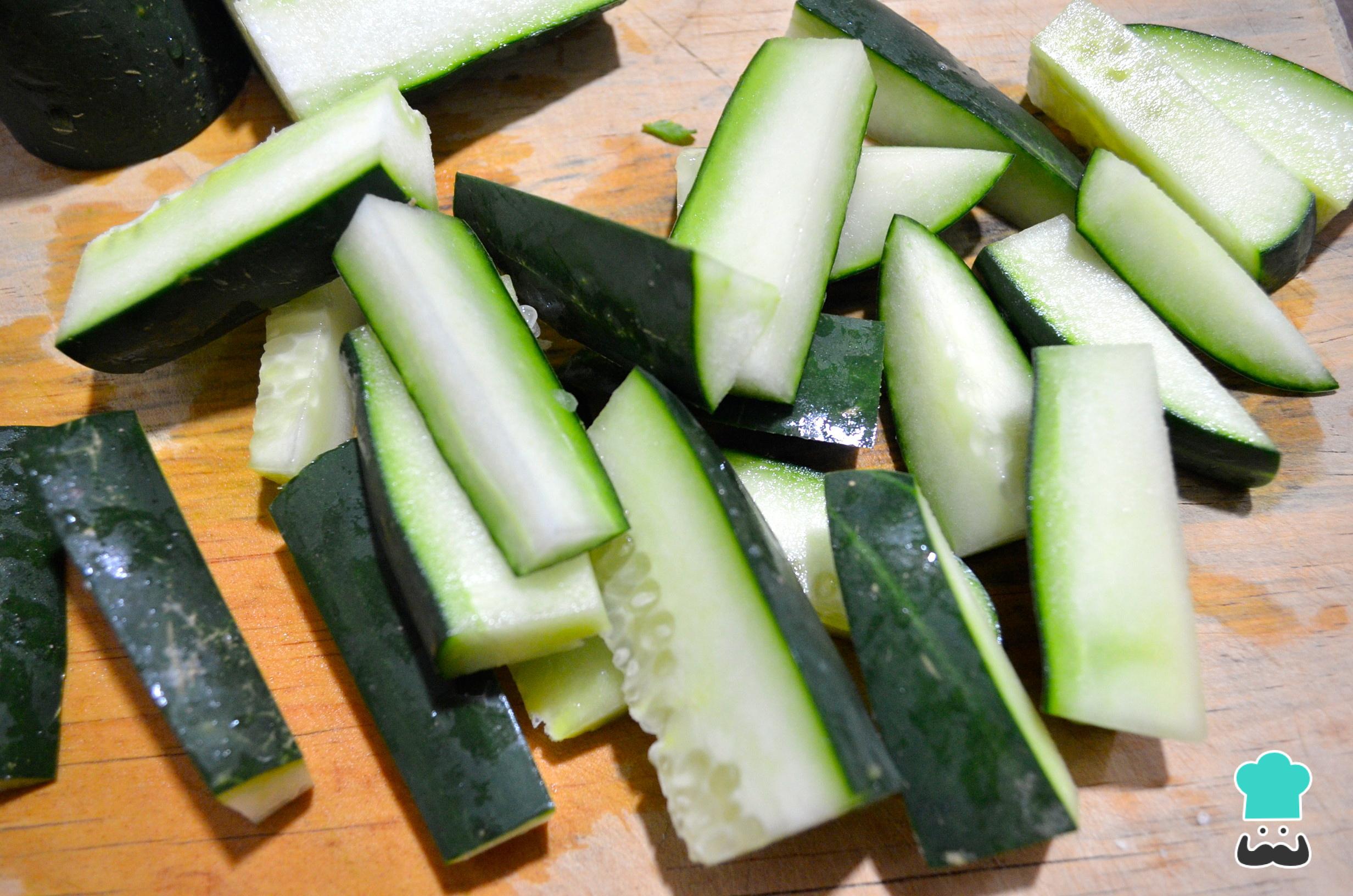 Corte o pepino com a pele em tiras médias, fatia de modo facilitar o processo, uma vez que o suco verde é preparado no liquidificador ou espremedor.