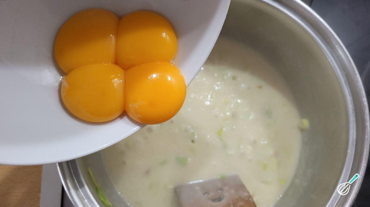 Quando engrossar, comece a adicionar as gemas, uma a uma sempre mexendo para não correr o risco de coagular.