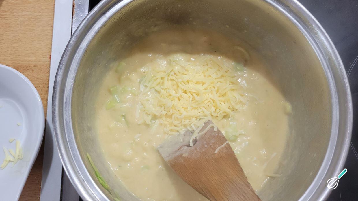 Adicione o queijo, deixe derreter e retire a panela do forno.