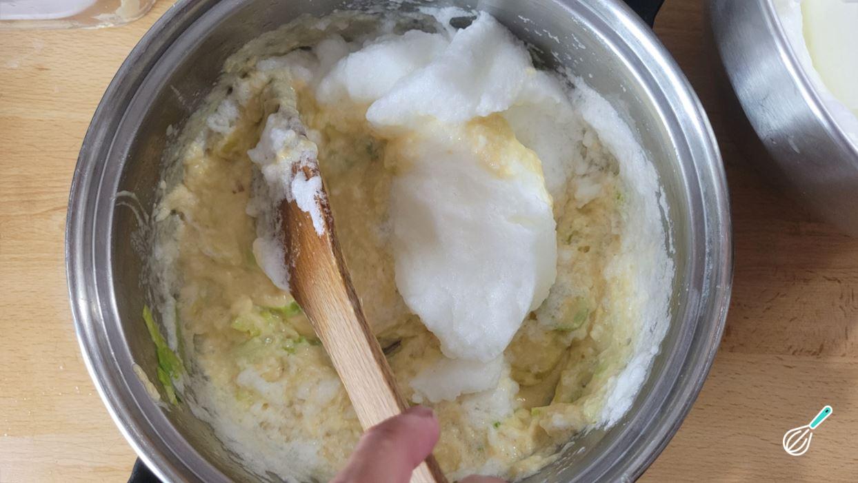 Nesse ponto, comece a adicionar as claras em neve aos poucos à mistura de gemas e leite, sempre de cima para baixo para manter a aeração.