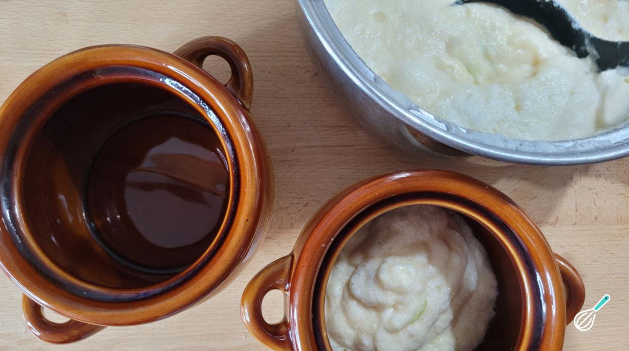 Quando tiver uma mistura homogênea, transfira para os potinhos de servir, de preferência individuais, que possam ir ao forno, como ramequins. Não encha até a boca para não transbordar porque eles vão inflar bastante.