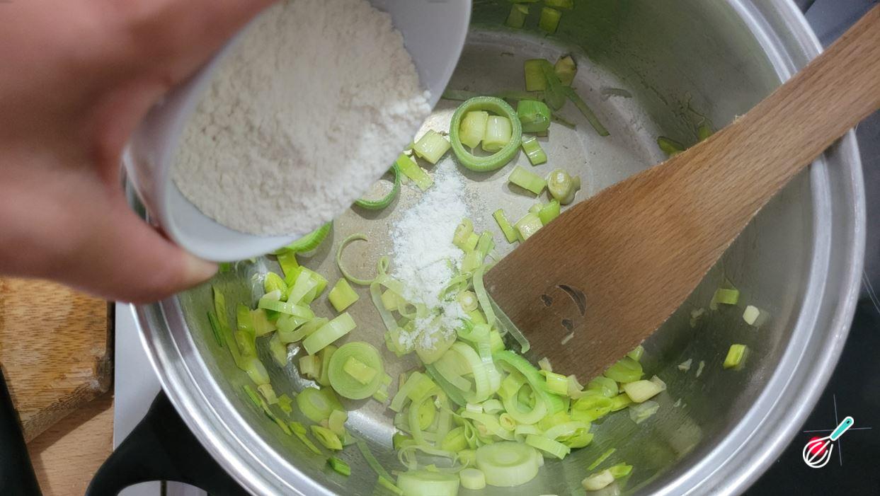 Nesse ponto, pode adicionar a farinha. A farinha junto com a manteiga vão formar o roux, a mistura que vai engrossar o molho, como se fosse um molho branco.
