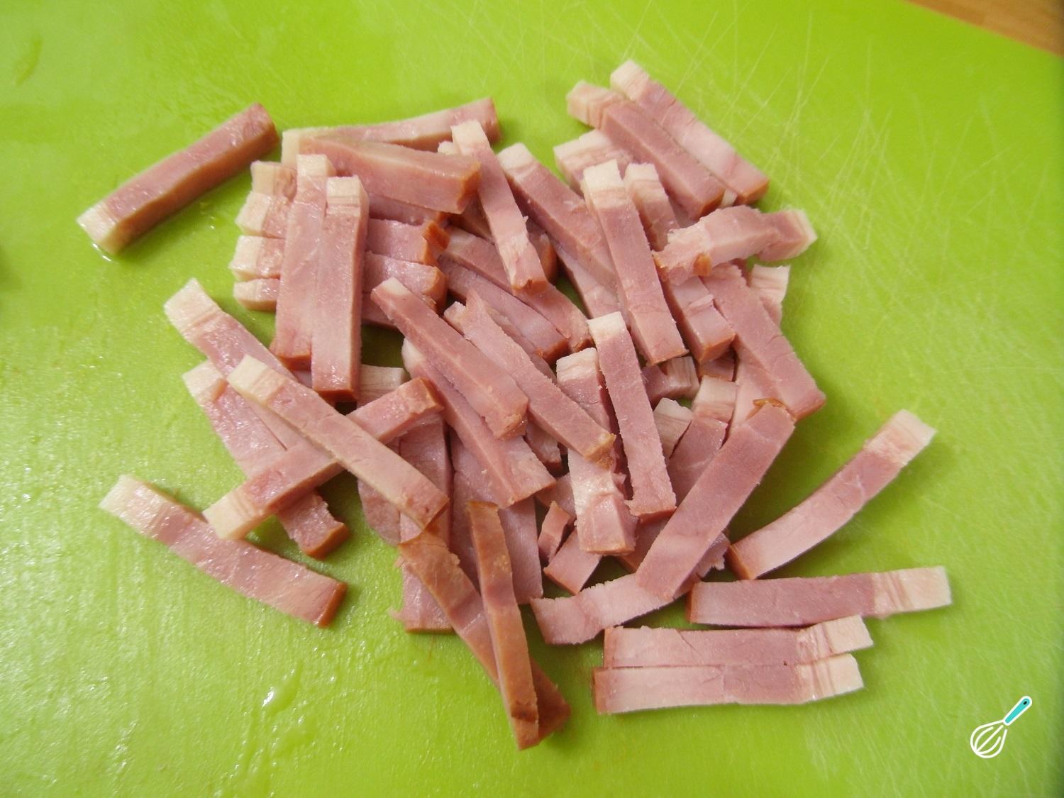 Para fazer esta receita de suflê com bacon corte o brócolis em pedaços e coza numa panela com água e sal por 5-10 minutos. Depois retire e pique com a faca ou em um processador.