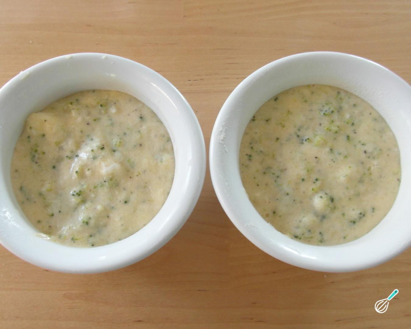 Finalmente coloque seu suflê de brócolis com bacon em ramekins untados e enfarinhados, deixando algum espaço livre até ao topo para que possam crescer sem vazar. Leve a assar no forno preaquecido a 180ºC por cerca de 15 minutos ou até dourar.