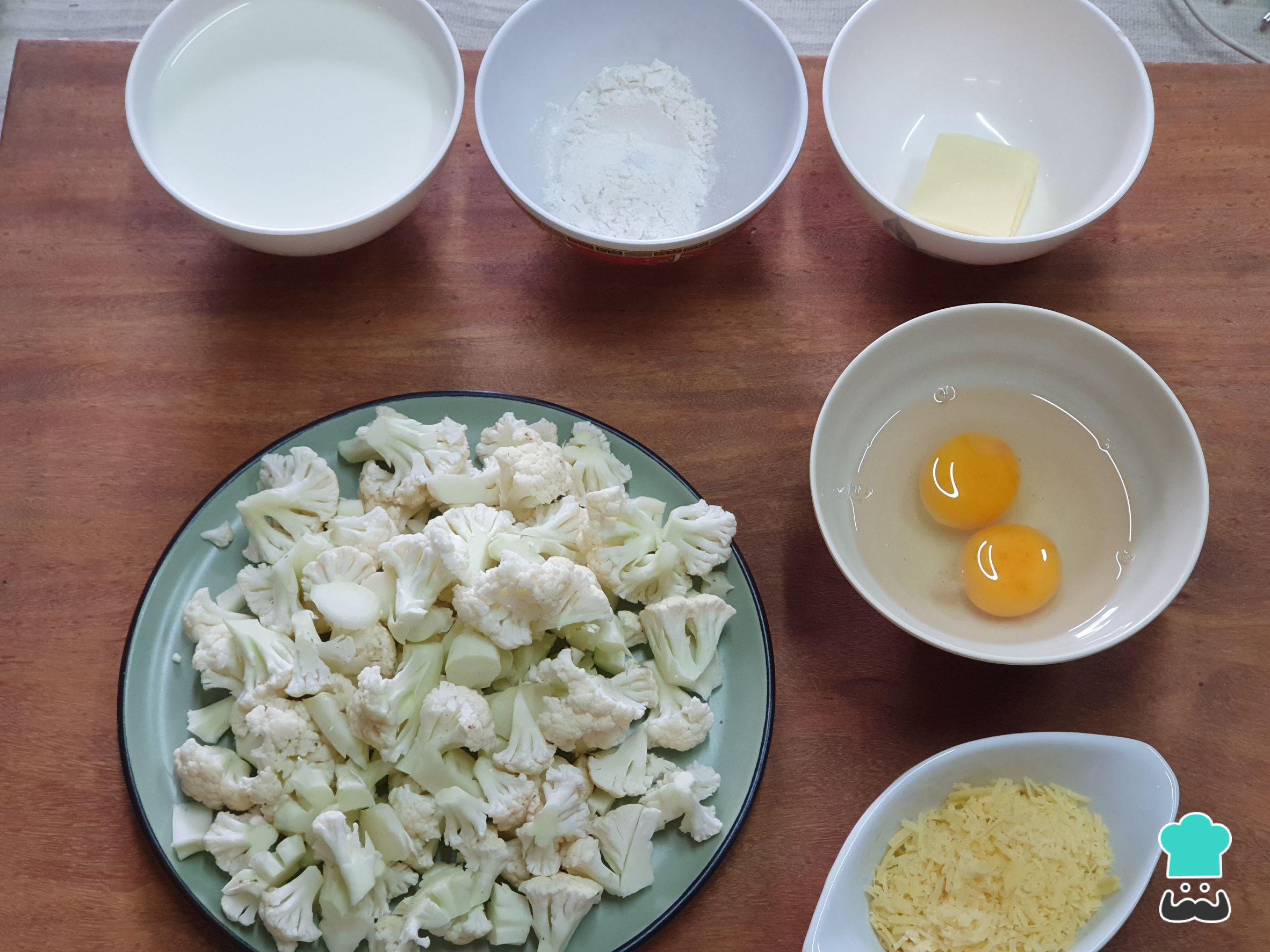 Separe todos os ingredientes do seu suflê de couve flor. Ao cortar a couve flor, aproveite os talos também e pique em pequenos floretes. Separe as claras das gemas. Em relação ao queijo, eu escolhi o parmesão, mas você poderá usar qualquer tipo de queijo.