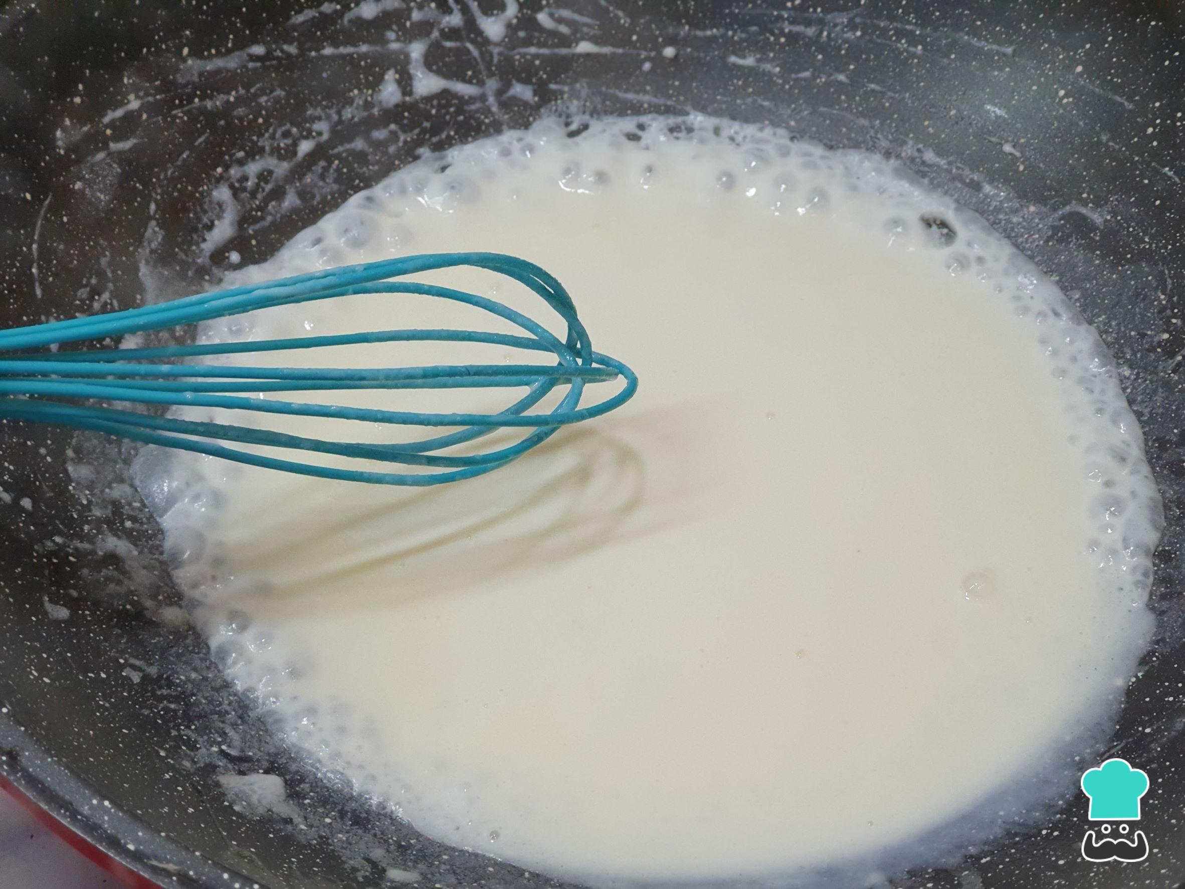 Acrescente o leite e mexa muito bem com fouet, sem parar, até que obtenha uma textura cremosa e sem grumos.