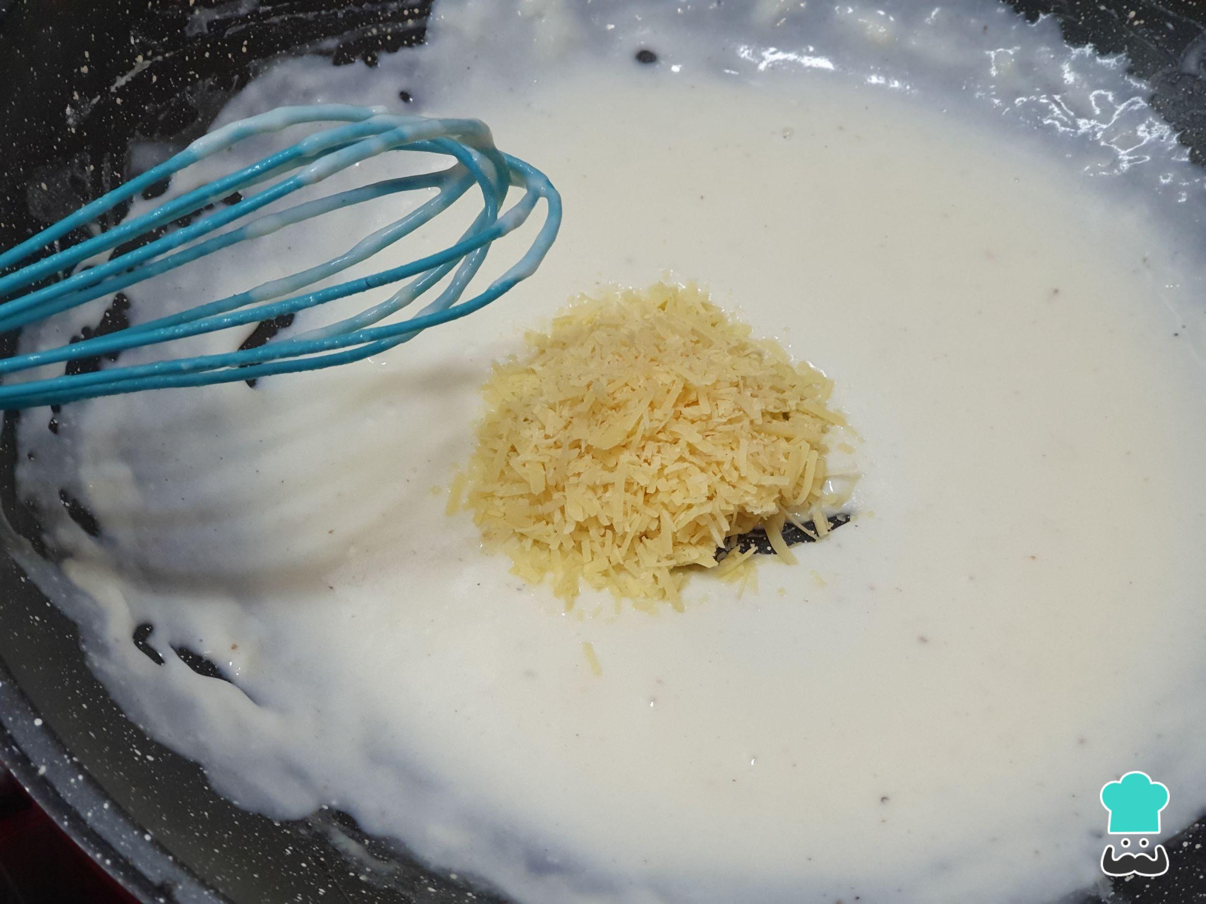 Adicione o queijo, acerte o sal e tempere com noz moscada. Misture bem até o queijo derreter completamente e desligue o fogo. Aguarde o creme ficar morno e pré-aqueça o forno a 160 graus.