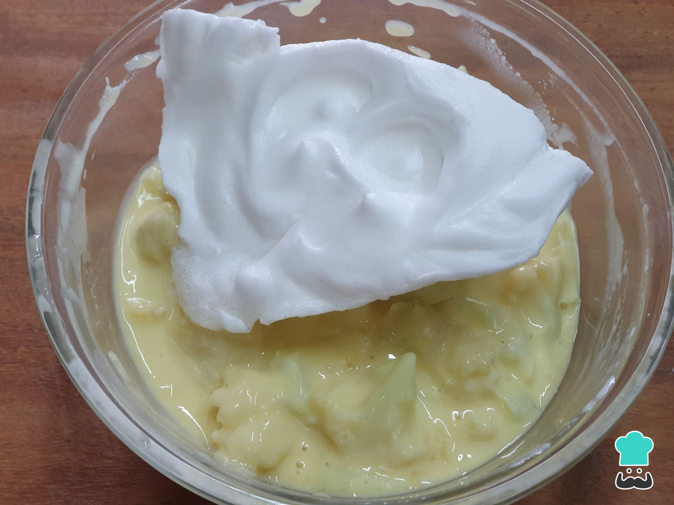 Primeiramente misture o creme com a couve flor. Cuidadosamente misture metade das claras, incorporando com movimentos delicados (sem bater). Depois junte a outra metade e envolta até que tudo esteja bem incorporado.