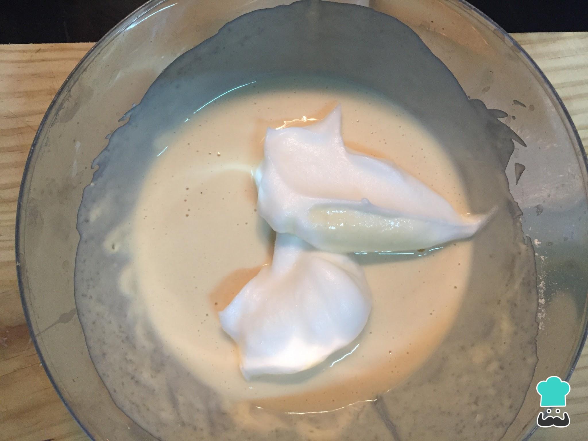 Em outra taça coloque as claras, o fermento e bata até formar claras em neve.