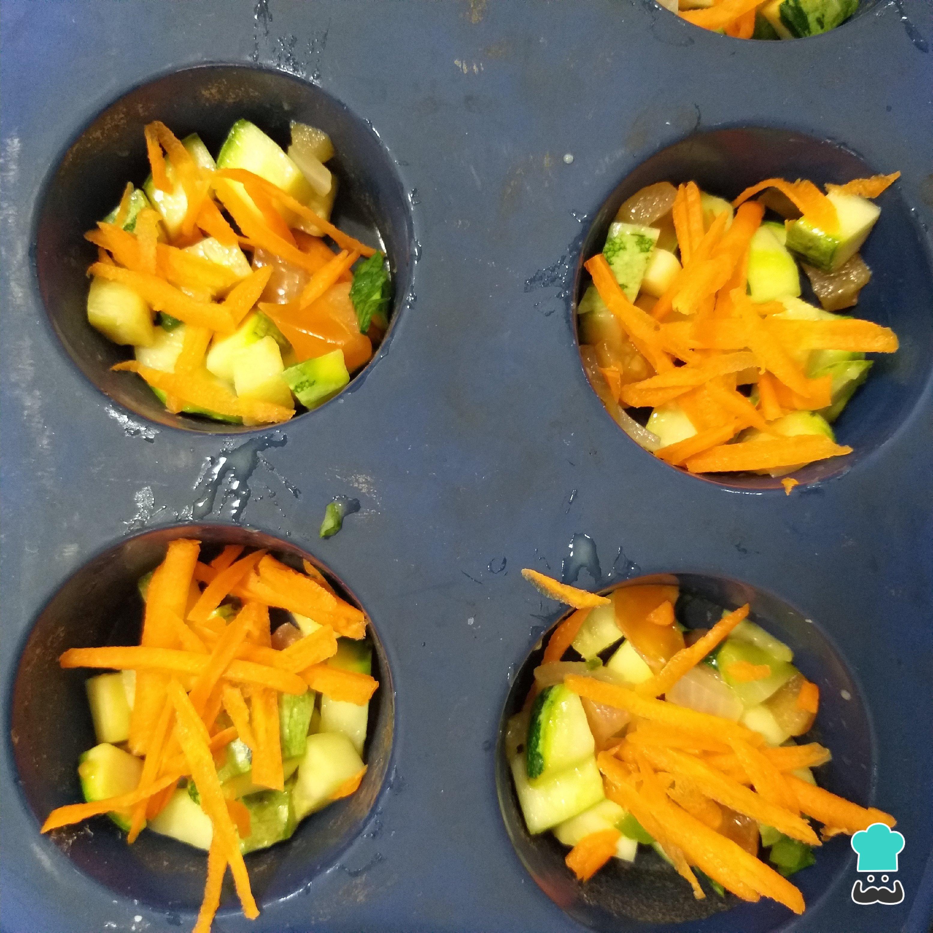 Transfira os legumes reservados e a cenoura ralada para formas untadas ou de silicone. Coloque a mistura de claras e gemas delicadamente.