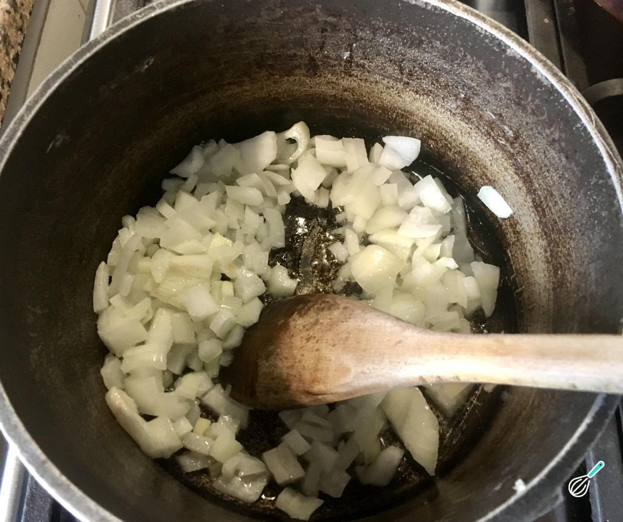 Descasque a cebola e pique em pedacinhos. Leve ao fogo uma panela com um fio de azeite ou óleo e, quando estiver quente, adicione a cebola. Deixe cozinhar por 1-2 minutos ou até ficar macia, mexendo de vez em quando, e desligue o fogo.