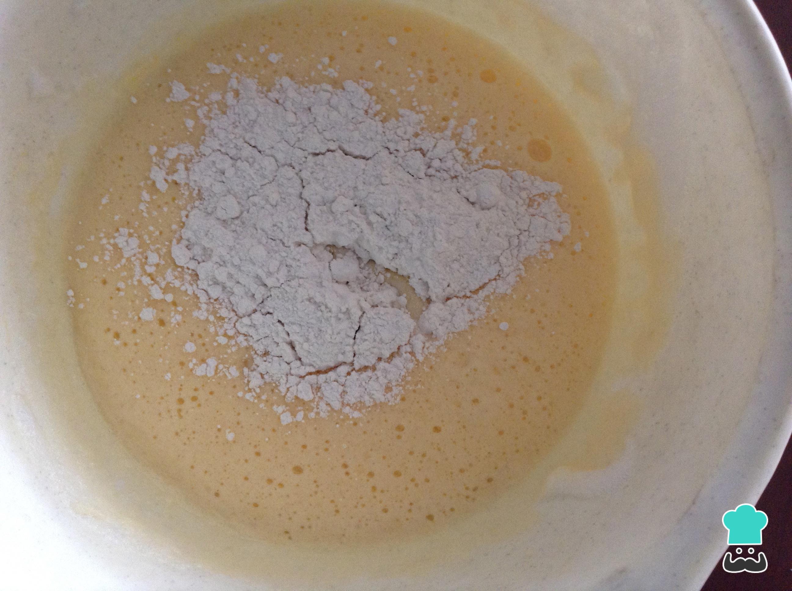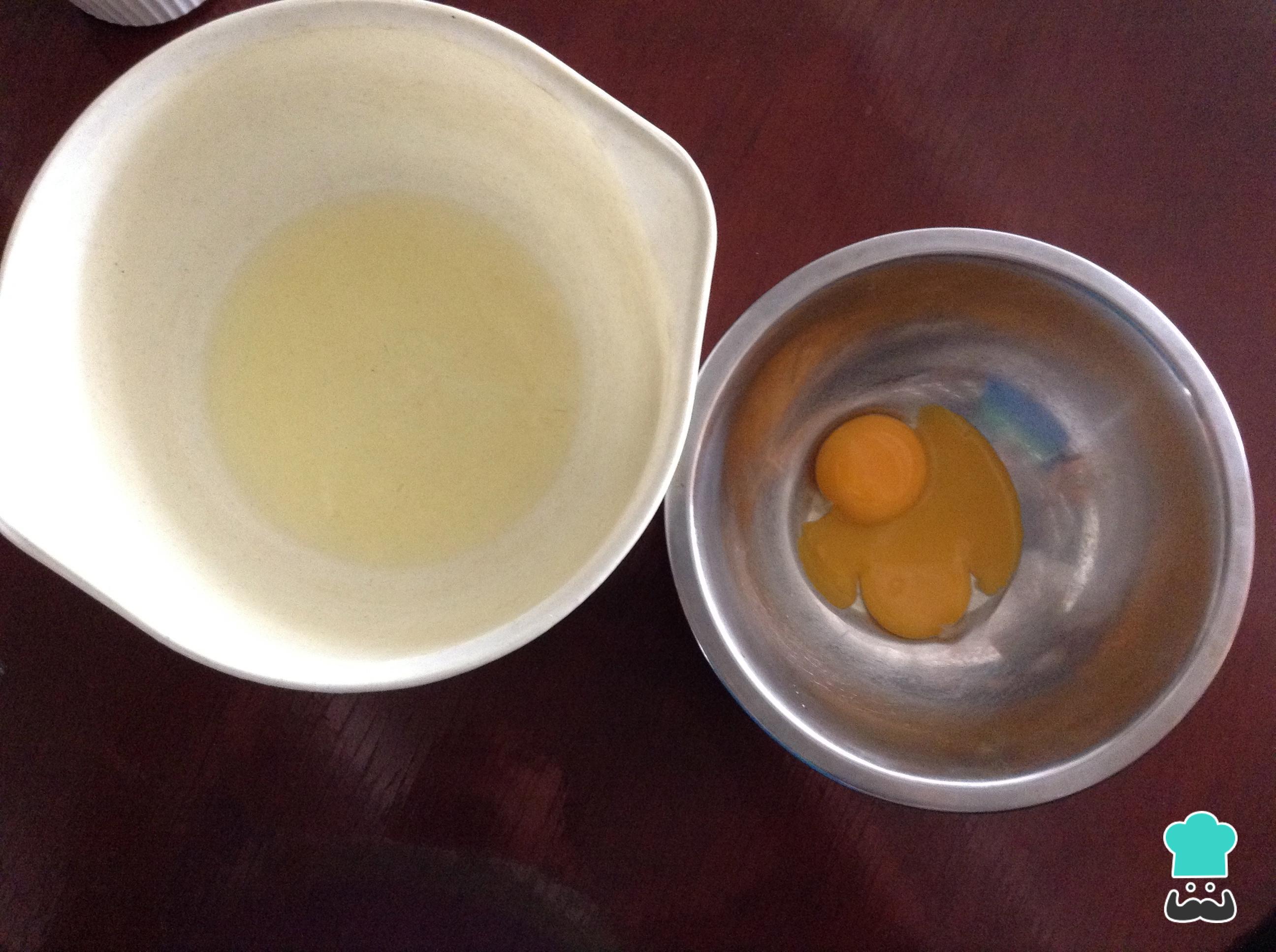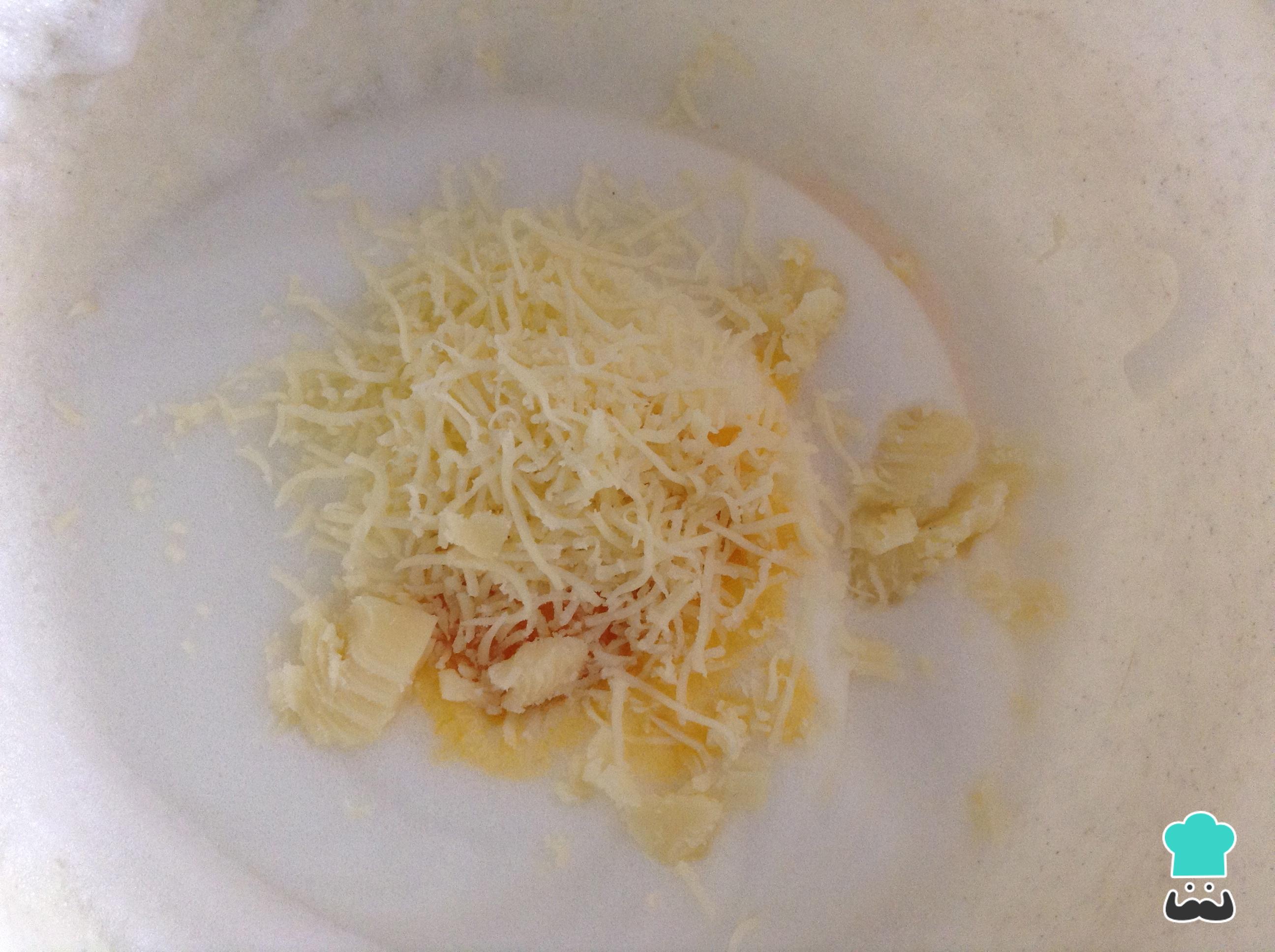 Bata as claras em ponto neve e, de seguida, acrescente as gemas e o queijo mussarela ralado. Misture com cuidado, envolvendo do centro para fora, para que as claras não baixem de volume.