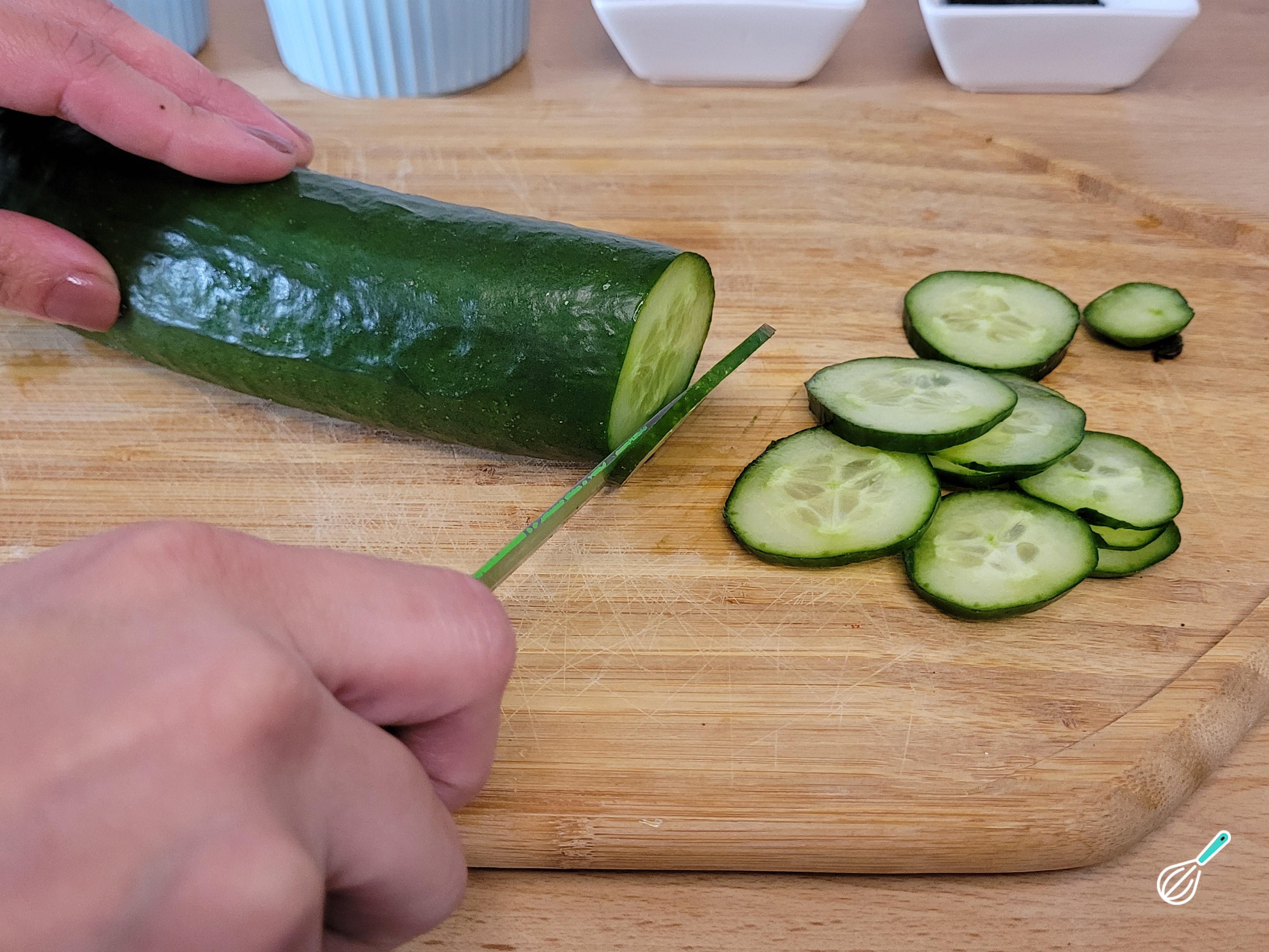 Corte o pepino em rodelas finas. Se preferir, pode usar um mandolim.