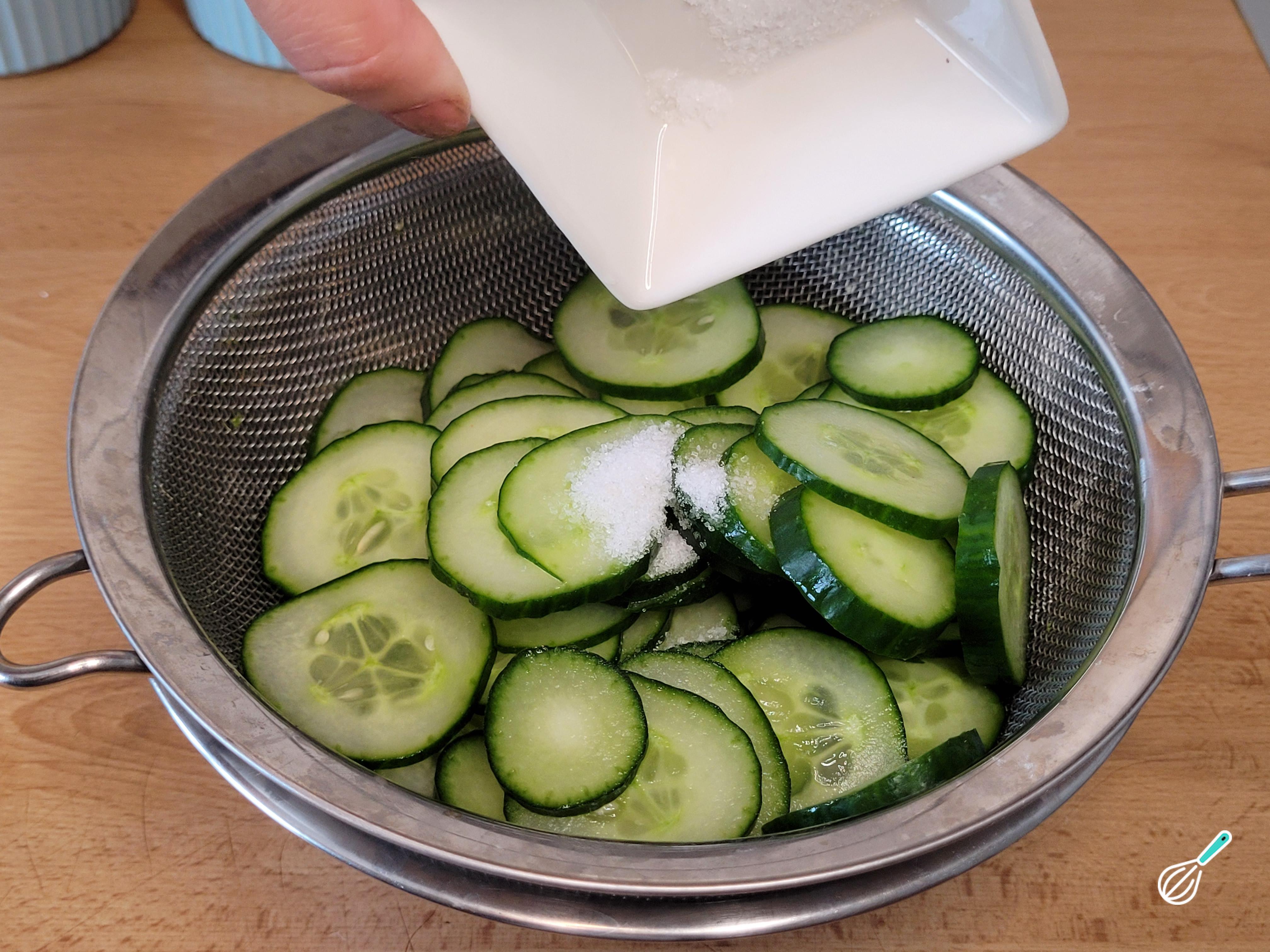 Coloque o pepino sobre uma peneira com uma tigela embaixo. Vamos preparar uma salmoura para retirar o excesso de água do pepino. Adicione todo o sal sobre o pepino, misture bem para envolver todas as fatias e deixe descansar por uns 10 minutos para que o pepino libere o excesso de água.